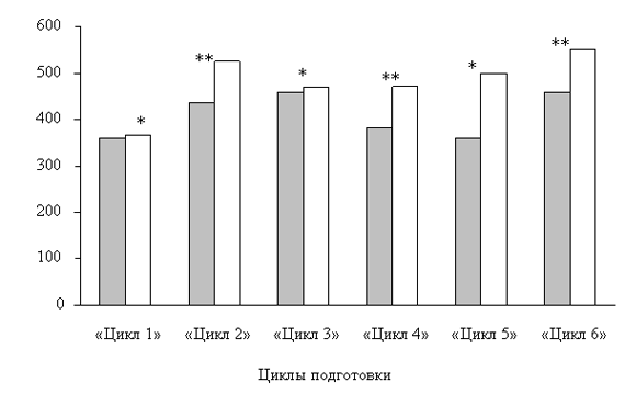 * - основные занятия проходили на фоне активизации систем функционального обеспечения физической работоспособности квалифицированных футболистов; ** - основные занятия проходили на фоне воздействия дополнительных тренировочных занятий. Рис. 1. Суммарный эффект основных и дополнительных тренировочных занятий в 1-6 циклах подготовки: Экспериментальная проверка программы показала ее эффективность в процессе подготовки спортсменов на этапе непосредственной подготовки к соревнованиям. Проведена оценка эффективности ТТД в контрольном и экспериментальном матче. Эти матчи были проведены с одним соперником (ФК "Олимпик Донецк") за три дня до начала соревновательного периода подготовки. На рисунках 2 и 3 схематически представлены изменения количества ТТД и брака ТТД в контрольном и экспериментальном матчах. На рисунках видно, что под воздействием экспериментальной программы увеличилось количество ТТД по всем показателям. Это свидетельствует об увеличении интенсивности выполнения ТТД в течение всего матча. Увеличение количественных характеристик ТТД одновременно увеличило качество их выполнения. Обращает на себя внимание снижение количества брака при отборе мяча, единоборствах вверху, атакующих действиях по основным показателям. Рис. 2. Количество ТТД в контрольном и экспериментальном матче
