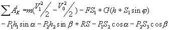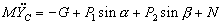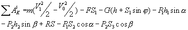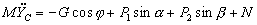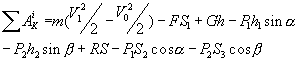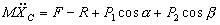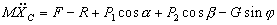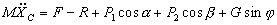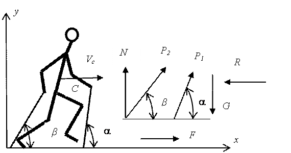 F- (X) составляющая реакции опоры на стопу; S1- перемещение точки приложения силы трения по направлению оси; S2- перемещение точки приложения силы отталкивания 1-ой палкой по направлению оси oX; S3- перемещение точки приложения силы отталкивания 2-ой палкой по направлению оси oX; S - длина шага; G - сила тяжести тела; h - высота изменения точки приложения силы тяжести тела; h1 - перемещение точки приложения силы отталкивания 1-ой палкой по направлению оси OY; h2 - перемещение точки приложения силы отталкивания 2-ой палкой по направлению оси oY; P1 - сила отталкивания 1-ой палкой; P2 - сила отталкивания 2-ой палкой; R - сила сопротивления среды; N - (Y) составляющая силы реакции опоры. Дополнительно проведя экспериментальные исследования и используя, например, результаты (кинограммы ходьбы, динамометрии и прочее) и при подстановке в вышестоящую формулу, возможно, определить энергетические затраты при ходьбе с приспособлениями (палками). Определение силовых характеристик при ходьбе со вспомогательными средствами отталкивания от нижней опоры Выражение для теоремы о движении центра масс имеет вид: В проекциях на оси декартовой системы координат выражение запишем следующим образом