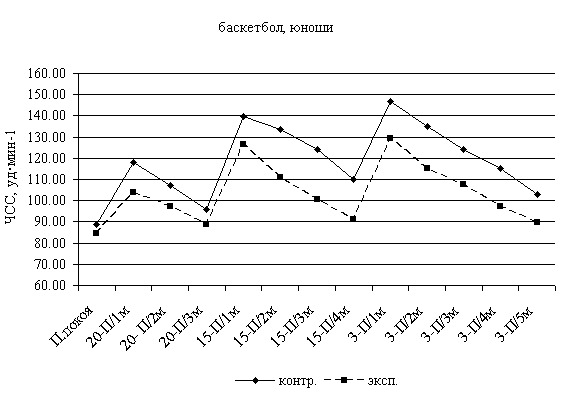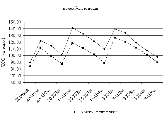 Рис. 4. Частота сердечных сокращений при выполнении пробы Летунова у студентов-волейболистов контрольной и экспериментальной групп после проведения эксперимента: * - различия достоверны при р<0, 05 После проведения эксперимента в контрольной группе баскетболистов ЧСС после выполнения 20 приседаний на первой, второй и третьей минутах восстановления составила соответственно 118, 00 уд·мин-1, 103, 86 уд·мин-1, 97, 14 уд·мин-1. В экспериментальной группе баскетболистов данные показатели составили соответственно 103, 86 уд·мин-1, 97, 14 уд·мин-1, 88, 86 уд·мин-1 (р<0, 05) (рис. 5). После проведения эксперимента в контрольной группе волейболистов ЧСС после выполнения 15-минутного бега на месте с высоким подниманием бедра на первой, второй, третьей и четвертой минутах восстановления составила соответственно 139, 67 уд·мин-1, 133, 5 уд·мин-1, 124, 17 уд·мин-1 и 110, 17 уд·мин-1. В экспериментальной группе баскетболистов данные показатели составили соответственно 126, 6 уд·мин-1, 111, 0 уд·мин-1, 100, 7 уд·мин-1 и 91, 0 уд·мин-1 (р<0, 05) (рис. 5). После проведения эксперимента в контрольной группе баскетболистов ЧСС после выполнения 3-минутного бега на месте в темпе 180 шагов в 1 мин на первой, второй, третьей, четвертой и пятой минутах восстановления составила соответственно 147, 0 уд·мин-1, 135, 0 уд·мин-1, 124, 3 уд·мин-1, 115, 0 уд·мин-1 и 102, 83 уд·мин-1. В экспериментальной группе баскетболистов данные показатели составили соответственно 129, 43 уд·мин-1, 115, 1 уд·мин-1, 107, 86 уд·мин-1, 97, 29 уд·мин-1 и 89, 86 уд·мин-1 (р<0, 05) (рис. 5).