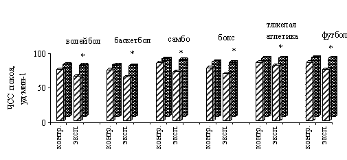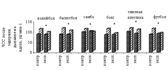 Рис. 2. Показатели времени задержки дыхания на вдохе у студентов контрольной и экспериментальной групп до и после проведения эксперимента: * - различия достоверны при р<0, 05 В группах боксеров изменения времени задержки дыхания на вдохе выражены не достоверно (рис. 2). В экспериментальной группе тяжелоатлетов увеличение времени задержки дыхания на вдохе наблюдалось от 50, 4 с до 57, 8 с при р<0, 05, в то время, как в контрольной группе тяжелоатлетов увеличение времени задержки дыхания на вдохе не достоверно (рис. 2). В экспериментальной группе футболистов увеличение времени задержки дыхания на вдохе наблюдалось от 36, 4 с до 47, 6 с при р<0, 05, в то время, как в контрольной группе футболистов увеличение времени задержки дыхания на вдохе не достоверно (рис. 2). Частота сердечных сокращений, регистрируемая после задержки дыхания на вдохе, в группах волейболистов, баскетболистов и тяжелоатлетов после проведения эксперимента стала достоверно выше по сравнению с данными, полученными до проведения эксперимента, что вполне объяснимо фактом увеличения времени задержки дыхания после проведения эксперимента. Тем не менее, в экспериментальных группах волейболистов, баскетболистов, самбистов, боксеров и футболистов значения частоты сердечных сокращений после задержки дыхания на вдохе достоверно ниже по сравнению с контрольными группами. До проведения эксперимента экспериментальные и контрольные группы достоверно не различались по данному показателю (р>0, 05) (рис. 3). После проведения эксперимента ЧСС после задержки дыхания на вдохе в экспериментальной группе волейболистов составила 90, 6 уд·мин-1, а в контрольной - 104, 0 уд·мин-1 (р<0, 05). В экспериментальной группе баскетболистов данный показатель после проведения эксперимента составил 97, 4 уд·мин-1, а в контрольной - 108, 3 уд·мин-1 (р<0, 05). В экспериментальной группе самбистов данный показатель после проведения эксперимента составил 92, 0 уд·мин-1, а в контрольной - 104, 6 уд·мин-1 (р<0, 05). Рис. 3. Показатели частоты сердечных сокращений после задержки дыхания на вдохе у студентов контрольной и экспериментальной групп до и после проведения эксперимента: * - различия достоверны при р<0, 05 В экспериментальной группе боксеров данный показатель после проведения эксперимента составил 83, 6 уд·мин-1, а в контрольной - 106, 2 уд·мин-1 (р<0, 05). В экспериментальной группе тяжелоатлетов данный показатель после проведения эксперимента составил 102, 6 уд·мин-1, а в контрольной - 108, 8 уд·мин-1 (р<0, 05). В экспериментальной группе футболистов данный показатель после проведения эксперимента составил 85, 6 уд·мин-1, а в контрольной - 105, 7 уд·мин-1 (р<0, 05) (рис. 3). По показателям пробы Летунова контрольные и экспериментальные группы студентов всех спортивных специализаций до проведения эксперимента достоверно не отличались между собой. Однако после проведения эксперимента были выявлены достоверные различия между контрольными и экспериментальными группами по показателям пробы Летунова. Наиболее существенные различия между контрольными и экспериментальными группами после проведения эксперимента были выявлены у студентов - представителей секций волейбола (рис. 4) и баскетбола (рис. 5). Так, после проведения эксперимента в контрольной группе волейболистов ЧСС после выполнения 20 приседаний на первой, второй и третьей минутах восстановления составила 