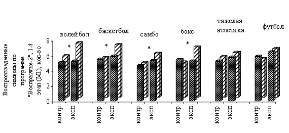 Рис. 5. Частота сердечных сокращений при выполнении пробы Летунова у студентов-баскетболистов контрольной и экспериментальной групп после проведения эксперимента: * - различия достоверны при р<0, 05 Уровень психофизиологических возможностей. Из психофизиологических показателей в результате применения системы индивидуализации наиболее существенные изменения были выявлены в показателях кратковременной памяти, регистрируемой по авторской программе "Восприятие - 2", по первому и второму этапу (рис. 6, 7). Контрольная и экспериментальная группы волейболистов, баскетболистов, самбистов, боксеров, достоверно не отличавшиеся между собой до проведения эксперимента (р>0, 05), после проведения эксперимента стали достоверно различаться. В экспериментальной группе волейболистов увеличение количества правильно воспроизведенных символов по программе "Восприятие-2" (тест №1) было зарегистрировано от 5, 18 до 7, 21 при р<0, 05, в то время, как в контрольной группе волейболистов увеличение количества правильно воспроизведенных символов по программе "Восприятие-2" (тест №1) не достоверно. Аналогичные изменения количества правильно воспроизведенных символов по программе "Восприятие-2" (тест №1) наблюдались в других экспериментальных группах. В экспериментальной группе баскетболистов увеличение количества правильно воспроизведенных символов наблюдалось от 5, 84 до 6, 98, в то время, как в контрольной группе баскетболистов увеличение количества правильно воспроизведенных символов не достоверно (рис. 6). В экспериментальной группе самбистов увеличение количества правильно воспроизведенных символов по программе "Восприятие-2" (тест №1) наблюдалось от 5, 34 до 5, 83 при р<0, 05, в то время, как в контрольной группе самбистов увеличение количества правильно воспроизведенных символов не достоверно (рис. 6). В группах боксеров увеличение количества правильно воспроизведенных символов по программе "Восприятие-2" (тест №1) наблюдалось от 5, 25 до 6, 64 с при р<0, 05, в то время, как в контрольной группе боксеров увеличение данного показателя не достоверно (рис. 6). В экспериментальной группе тяжелоатлетов увеличение количества правильно воспроизведенных символов по программе "Восприятие-2" (тест №1) наблюдалось от 5, 75 до 5, 96 при р<0, 05, в то время, как в контрольной группе тяжелоатлетов увеличение количества правильно воспроизведенных символов не достоверно (рис. 6). В экспериментальной группе футболистов увеличение количества правильно воспроизведенных символов по программе "Восприятие-2" (тест №1) наблюдалось от 6, 26 до 6, 45 при р<0, 05, в то время, как в контрольной группе футболистов увеличение количества правильно воспроизведенных символов не достоверно (рис. 6).