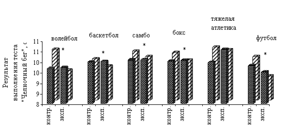 Рис. 6. Показатели кратковременной памяти по количеству воспроизведенных символов по программе "Восприятие - 2" (первый этап) у студентов контрольной и экспериментальной групп до и после проведения эксперимента: * - различия достоверны при р<0, 05 В экспериментальной группе волейболистов увеличение количества правильно воспроизведенных символов по программе "Восприятие-2" (тест №2) было зарегистрировано от 7, 3 до 8, 6 при р<0, 05, в то время, как в контрольной группе волейболистов увеличение количества правильно воспроизведенных символов по программе "Восприятие-2" (тест №1) не достоверно (рис. 7). Аналогичные изменения количества правильно воспроизведенных символов по программе "Восприятие-2" (тест №2) наблюдались в других экспериментальных группах. В экспериментальной группе баскетболистов увеличение количества правильно воспроизведенных символов наблюдалось от 7, 49 до 8, 2, в то время, как в контрольной группе баскетболистов увеличение количества правильно воспроизведенных символов не достоверно (рис. 7). В экспериментальной группе самбистов увеличение количества правильно воспроизведенных символов по программе "Восприятие-2" (тест №2) наблюдалось от 4, 78 до 57, 42 при р<0, 05, в то время, как в контрольной группе самбистов увеличение времени задержки дыхания на вдохе не достоверно (рис. 7). В группах боксеров увеличение количества правильно воспроизведенных символов по программе " Восприятие-2" (тест №2) наблюдалось от 6, 36 до 7, 6 при р<0, 05, в то время, как в контрольной группе боксеров увеличение данного показателя не достоверно (рис. 7). В экспериментальной группе тяжелоатлетов увеличение количества правильно воспроизведенных символов по программе "Восприятие-2" (тест №2), как в контрольной группе, не достоверно (рис. 7). ![]() Рис. 7. Показатели кратковременной памяти по количеству воспроизведенных символов по программе "Восприятие - 2" (второй этап) у студентов контрольной и экспериментальной групп до и после проведения эксперимента: * - различия достоверны при р<0, 05 В экспериментальной группе футболистов увеличение количества правильно воспроизведенных символов по программе "Восприятие-2" (тест №2) наблюдалось от 6, 46 до 8, 32 при р<0, 05, в то время, как в контрольной группе футболистов увеличение количества правильно воспроизведенных символов не достоверно (рис. 7). Уровень физической подготовленности. В результате применения системы индивидуализации при распределении студентов по спортивным секциям и при построении учебного процесса по физическому воспитанию было выявлено достоверное уменьшение времени выполнения теста "Челночный бег", у студентов некоторых спортивных специализаций - представителей секций волейбола, баскетбола, самбо (рис. 8). Контрольная и экспериментальная группы волейболистов, баскетболистов, самбистов, достоверно не отличавшиеся между собой до проведения эксперимента (р>0, 05), после проведения эксперимента стали достоверно различаться. В экспериментальной группе волейболистов уменьшение времени выполнения теста "Челночный бег" было зарегистрировано от 9, 73 с до 9, 42 с при р<0, 05, в то время, как в контрольной группе волейболистов уменьшение времени выполнения теста "Челночный бег" не достоверно (рис. 8). Аналогичные изменения времени выполнения теста "Челночный бег" наблюдались в других экспериментальных группах. В экспериме