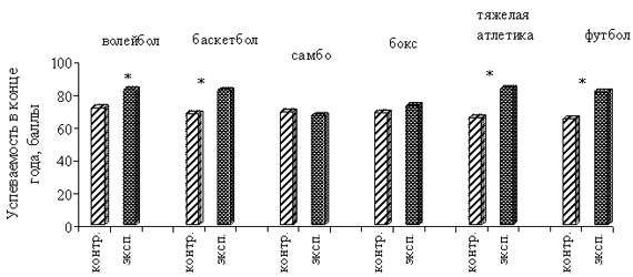 Рис. 9. Показатели успеваемости студентов контрольной и экспериментальной групп после проведения эксперимента: * - различия достоверны при р<0, 05 После проведения эксперимента в контрольной группе волейболистов успеваемость в конце учебного года составила 71, 01 балл. В экспериментальной группе волейболистов данный показатель составил 81, 57 баллов (р<0, 05) (рис. 9). После проведения эксперимента в контрольной группе баскетболистов успеваемость в конце учебного года составила 67, 37 баллов. В экспериментальной группе баскетболистов данный показатель составил 81, 14 баллов (р<0, 05) (рис. 9). После проведения эксперимента в контрольной группе тяжелоатлетов успеваемость в конце учебного года составила 64, 80 баллов. В экспериментальной группе тяжелоатлетов данный показатель составил 82, 54 балла (р<0, 05) (рис. 9). После проведения эксперимента в контрольной группе футболистов успеваемость в конце учебного года составила 64, 46 баллов. В экспериментальной группе футболистов данный показатель составил 80, 54 балла (р<0, 05). Выводы. 1. Показана целесообразность применения системы индивидуализации на занятиях по физическому воспитанию в высших учебных заведениях. Выявлено, что по ряду показателей функциональной подготовленности результаты студентов экспериментальной группы достоверно улучшились, в то время как показатели тестирования контрольной группы улучшились недостоверно или не так явно, как в экспериментальной группе. 2. В результате применения системы индивидуализации при распределении студентов по спортивным секциям и при построении учебного процесса по физическому воспитанию, было выявлено достоверное увеличение времени задержки дыхания на вдохе (проба Штанге) у студентов - представителей секций волейбола, баскетбола, самбо. 3. Выявлены достоверные различия между контрольными и экспериментальными группами студентов - представителей секций волейбола и баскетбола по показателям пробы Летунова в результате применения системы индивидуализации. 4. Выявлены достоверные изменения показателей кратковременной памяти, регистрируемой по авторской программе "Восприятие - 2", по первому и второму этапу в группах волейболистов, баскетболистов, самбистов, боксеров, достоверно не отличавшиеся между собой до проведения эксперимента (р>0, 05), после проведения эксперимента стали достоверно различаться. 5. В результате применения системы индивидуализации при распределении студентов по спортивным секциям и при построении учебного процесса по физическому воспитанию было выявлено достоверное уменьшение времени выполнения теста "Челночный бег", у студентов некоторых спортивных специализаций - представителей секций волейбола, баскетбола, самбо. В перспективе дальнейших исследований предполагается совершенствование системы индивидуализации в физическом воспитании студентов. Литература: 1. Ермаков С.С. Педагогические условия обеспечения занятий со студентами с ослабленным здоровьем // Физическое воспитание студентов творческих специальностей. - 2003. - N 1. - С. 66-71. 2. Зайцев В.П., Бондаренко Т.В., Панина Е.Л. Использование спортивных игр и единоборств как средства психофизической регуляции профессиональной работоспособности будущих специалистов // Физическое воспитание студентов творческих специальностей. - 2008. - № 1. - С. 71-77. 3. Барыбина Л., Козина Ж.Л., Тихе