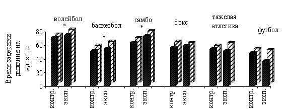 Рис. 1. Показатели частоты сердечных сокращений перед задержкой дыхания у студентов контрольной и экспериментальной групп до и после проведения эксперимента: * - различия достоверны при р<0, 05 В экспериментальной группе самбистов снижение ЧСС в состоянии покоя наблюдалось от 83, 2 уд·мин-1 до 72, 0 уд·мин-1 при р<0, 05, в то время, как в контрольной группе самбистов изменение ЧСС покоя не достоверно (рис. 1). В экспериментальной группе боксеров снижение ЧСС в состоянии покоя наблюдалось от 78, 8 уд·мин-1 до 68, 4 уд·мин-1 при р<0, 05, в то время, как в контрольной группе боксеров изменение ЧСС покоя не достоверно (рис. 1). В экспериментальной группе тяжелоатлетов снижение ЧСС в состоянии покоя наблюдалось от 85, 2 уд·мин-1 до 80, 4 уд·мин-1 при р<0, 05, в то время, как в контрольной группе тяжелоатлетов изменение ЧСС покоя не достоверно (рис. 1). В экспериментальной группе футболистов снижение ЧСС в состоянии покоя наблюдалось от 85, 6 уд·мин-1 до 74, 8 уд·мин-1 при р<0, 05, в то время, как в контрольной группе футболистов изменение ЧСС покоя не достоверно (рис. 1). Кроме того, в результате применения системы индивидуализации при распределении студентов по спортивным секциям и при построении учебного процесса по физическому воспитанию, было выявлено достоверное увеличение времени задержки дыхания на вдохе (проба Штанге) у студентов некоторых спортивных специализаций - представителей секций волейбола, баскетбола, самбо (рис. 2). Контрольная и экспериментальная группы волейболистов, баскетболистов, самбистов, достоверно не отличавшиеся между собой до проведения эксперимента (р>0, 05), после проведения эксперимента стали достоверно различаться. В экспериментальной группе волейболистов увеличение времени задержки дыхания на вдохе было зарегистрировано от 74, 0 с до 77, 2 с при р<0, 05, в то время, как в контрольной группе волейболистов увеличение времени задержки дыхания на вдохе не достоверно (рис. 2). Аналогичные изменения времени задержки дыхания на вдохе наблюдались в других экспериментальных группах. В экспериментальной группе баскетболистов увеличение времени задержки дыхания на вдохе наблюдалось от 54, 7 с до 59, 7 с, в то время, как в контрольной группе баскетболистов увеличение времени задержки дыхания на вдохе не достоверно (рис. 1). В экспериментальной группе самбистов увеличение времени задержки дыхания на вдохе наблюдалось от 73, 0 с до 75, 6 с при р<0, 05, в то время, как в контрольной группе самбистов увеличение времени задержки дыхания на вдохе не достоверно (рис. 2).