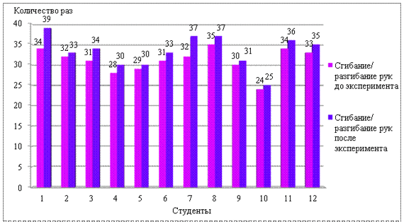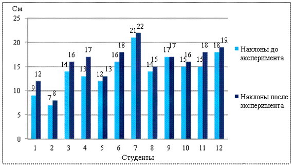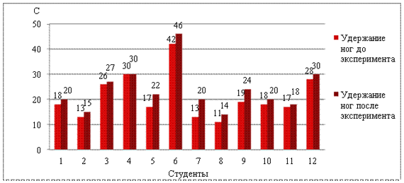 В конце изучения этого комплекса группе студентов было предложено повторить тестирование. Причем, упражнение на гибкость исполнялось на выдохе, при упражнении сгибание и разгибание рук в локтевых суставах, поднимание рук выполнялось на полном выдохе. Упражнение с удержанием ног фиксировалось при задержке дыхания. По результатам эксперимента было выяснено, что показатели тестирования у слабослышащих студентов стали выше предыдущих. Средний показатель результатов тестирования студентов на гибкость до эксперимента равнялся 14,25 см, ошибка среднего значения составила m ±1,095. После эксперимента - 15,92 см, ошибка среднего значения была m ±1,048, что показывает прирост результатов в среднем на 11,7%. Показатели тестирования гибкости не имели достоверных различий P>0,05 при t=1,1 (рис.1). Рис. 1. Результаты теста на гибкость Результаты показателей силы при сгибании и разгибании рук с отягощением увеличились на 2,25 раза, что составило в среднем 7,24%. Показатели силы не имели достоверных различий P>0,05 при t=1,6 (рис.2). Рис. 2. Результаты теста с отягощением Прирост показателей развития силовой выносливости при удержании ног на время составил в среднем 2,83 с, что составило 13,49%. Результаты развития силовой выносливости не имели достоверных различий P>0,05 при t=0,79 (рис 3). Рис. 3. Результаты теста на выносливость По окончанию эксперимента был проведен опрос, в результате которого выяснилось, что благодаря внедрению методики динамичного дыхания, состояние здоровья слабослышащих студентов улучшилось, повысился интерес и мотивация к занятиям по физическому воспитанию. Таким образом, изученный комплекс динамических дыхательных упражнений способствует повышению работоспособности и влияет на укрепление общего здоровья студентов группы реабилитационной гимнастики. Выводы: 1. Предложенный комплекс динамических дыхательных упражнений способствовал обучению слабослышащих студентов правильному дыханию при выполнении физических упражнений, что отразилось на улучшении показателей физической подготовленности. 2. В результате проведения педагогического эксперимента были улучшены показатели физической подготовленности слабослышащих студентов: - прирост показателей гибкости равнялся 1,66 см, что составило - 11,7%; - улучшение показателей сгибания и разгибания рук в локтевых суставах с отягощением в 1 кг в положении стоя - 2,25 раза (7,24%); - показатель времени удержания ног под углом 450 увеличился на 2,83 с, что составило 13,49%. 3. Показатели тестирования физической подготовленности слабослышащих студентов не имели достоверной разницы (P>0,05), так как количество студентов данного контингента ограничено, предложенный комплекс динамических дыхательных упражнений не может являться окончательным решением в повышении физической подготовленности. Дальнейшее исследование планируется направить на изучение и оценку физического состояния студентов с другими заболеваниями и разработку новых комплексов упражнений для групп реабилитационной гимнастики. Литература. 1. Бойко Е.А. Энциклопедия дыхательной гимнастики // Сер. "Медицина и здоровье". - М.: Вече, 2007. - 176 с. 2. Космолинский Ф.П. Физическая культура и работоспособность. - М.: Знание, 1983. - 64 с. 3. Кузнецова Т.Д. Дыхательные упражнения в физическом воспитании / Т.Д Кузнецова, П.М. Левитский, В.С. Язловецкий. - К.: Здоровье, 1989. - 136 с. 4. Куде