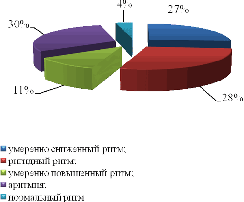 Особенностями методики лечебной гимнастики больных, после оперативного лечения ГИ являлись: соблюдение дозировки физических упражнений в зависимости от состояния больного и повышение нагрузки лишь при непременном условии выполнения без напряжения упражнений предыдущего этапа. Дозировка физических упражнений проводилась дифференцированно путем выбора исходных положений, характера упражнений и их продолжительности, темпа выполнения, количеством мышечных групп, участвующих в упражнении, соотношением физических и дыхательных упражнений (1:2,1:3) и т.д. Состояние вегетативной нервной системы определялось по показателям вариабельности сердечного ритма. Анализ вариабельности сердечного ритма осуществлялся при помощи прибора и компьютерной программы для анализа и интерпретации электрокардиограммы "Фазаграф-П". По результатам тестирования сердечного ритма ЧСС у больных объединенной группы составила 69,8±3,30 уд/мин. (±m). Оценка характера ритма сердца при помощи компьютерной программы "Фазаграф-П" показала, что у 30,2% больных диагностируется аритмия, у 28,3% больных ригидный ритм и еще у 26,4% больных ритм умеренно снижен (рис.1). Умеренно повышенный ритм зафиксирован у 11,3% больных. Нормальный ритм имели только 3,8% больных. Показатели баланса парасимпатического и симпатического отделов нервной системы только в 1,9% случаев указывали на то, что вегетативный гомеостаз сохранен.