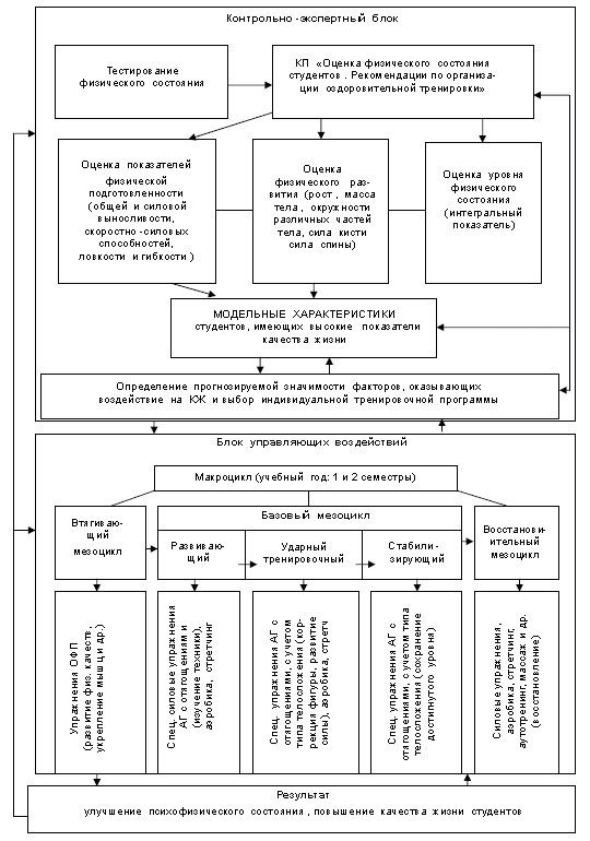 И.В. Самсоненко [10] разработана методика повышения качества жизни студентов с использованием атлетической гимнастики и информационных технологий. Содержание методики мы представили в виде структурной схемы, которая включает следующие блоки: контрольно-экспертный и управляющих воздействий (рис. 2).