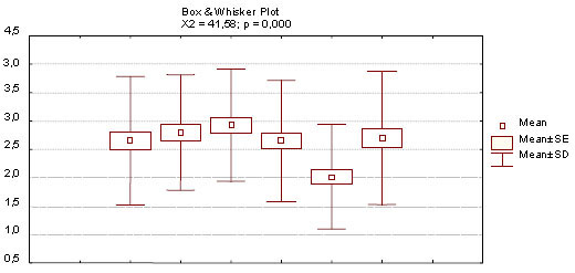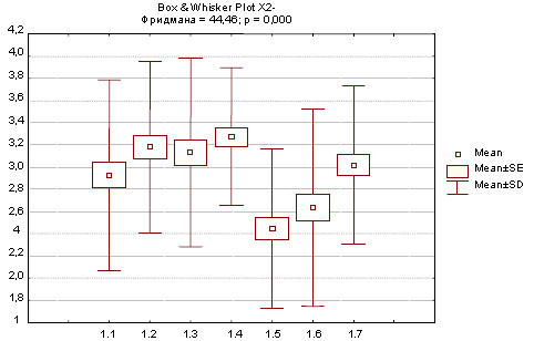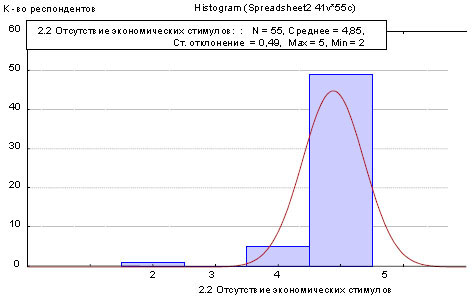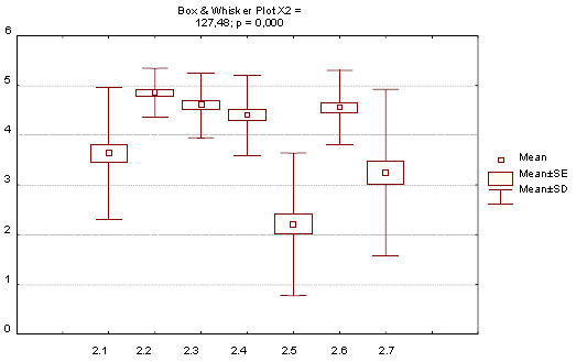 Рис. 3. Трудности наиболее препятствуют развитию спорта и решению проблем. 2.1 Проблемы законодательного характера, 2.2 Отсутствие экономических стимулов, 2.3 Недостаточный уровень поддержки со стороны центральной власти, 2.4 Недостаточный уровень поддержки со стороны местной власти, 2.5 Препятствия со стороны общественности, 2.6 Ограниченные ресурсы в населении, 2.7 Отсутствие квалифицированных кадров На гистограмме (рис.4) можно увидеть, что на вопрос об отсутствии экономических стимулов для развития спорта практически все респонденты выставили высший балл по пятибалльной шкале.
