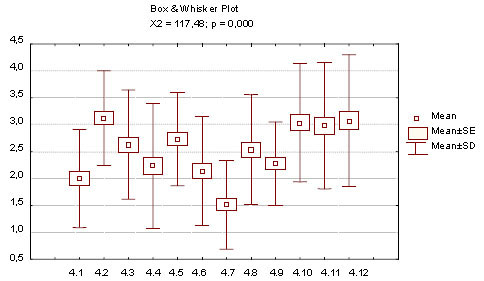 Рис. 5. Средства распространения информации о спортивной деятельности. 4.1 Подает информацию. в прессу, 4.2 Издает собственный бюллетень, 4.3 Распространяет буклеты открытки, 4.4 Через собственную веб-страницу, 4.5 Проводит презентации, 4.6 Принимает участие в конференциях, 4.7 Издает годовые отчеты, 4.8 Предоставляет информацию в справочники, 4.9 Люди сами узнают, 4.10 Представители посещают дошкольные заведения, 4.11 Представители посещают младшие классы школ, 4.12 Представители посещают родительские собрания в школах. Анализируя различные направления развития олимпийского движения в регионе (рис. 6) эксперты отметили как наиболее важные следующие: развитие экономической базы, развитие спортивной инфраструктуры, развитие транспортной инфраструктуры страны, медицинское обслуживание сборных команд и спортивных клубов и школ, соответствие спортивных баз, материального обеспечения спортсменов, тренерского состава, соответствие квалификации тренерского состава международным стандартам. Одним из факторов который, по мнению экспертов должным образом отвечает современным требованиям подготовки спортсменов высшей квалификации является тренерский состав.