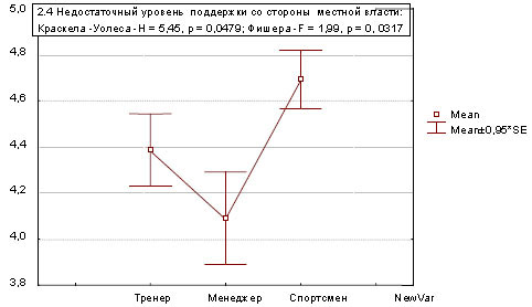 Рис. 8. Мнение тренеров, менеджеров и спортсменов о поддержке со стороны местных властей. В исследовании также выяснялось мнение тренеров, менеджеров и спортсменов о необходимости предоставления информации в прессу. Ожидаемым результатом этого пункта опроса является тот факт, что спортсмены являются наиболее заинтересованной стороной обнародования информации о спортивной деятельности клуба через прессу. В газетах и журналах вспоминают чаще всего о спортсмене. В меньшем количестве случаев о тренерах, и еще меньше о руководителей спортивных организации. Это не касается отдельных видов спорта, таких как хоккей, футбол, фигурное катание на коньках, в которых тренеры и менеджеры клубов есть иногда более известными, чем спортсмены, которых они тренируют [6]. Выводы. Стандартизированное интервью является действенным инструментом научно-исследовательской работы. Следует отметить наиболее интересные выводы анкетного исследования, касающиеся внедрения инноваций в управление олимпийским спортом. Считают целесообразным внедрение иностранного опыта, прежде всего спортсмены. Видимо это можно объяснить возрастом и прогрессивностью молодых людей, которые в большей степени способны к инновациям. Видят резерв во внедрении иностранного опыта и тренеры, поскольку он позволит решить вопрос материального обеспечения и спортсменов и тренеров. Менее всего заинтересованы во внедрении иностранного опыта управления спортом менеджеры. Это связано, скорее всего, с дополнительной работой, переходом на международные стандарты оценки их труда, оплаты труда, жесткие требования к оценке эффективности их деятельности. В работе даны результаты ответов на вопрос относительно мнения тренеров, менеджеров и спортсменов относительно поддержки со стороны местных властей. Прежде всего, рассчитывают на поддержку местной власти спортсмены. Надеются также тренеры и менее всего рассчитывают на эффективность сотрудничества и поддержку местных властей менеджеры. Но, в данном вопросе, такова позиция менеджеров обусловлена, пожалуй, прагматизмом и более высоким уровнем информированности о финансовом состоянии дел. Литература 1. Шкребтий Ю.М. Правовое и нормативно-методическое обеспечение олимпийской подготовки // Наука в олимпийском спорте. 2005. № 1, с. 135-139. 2. Сазонец В.И. Международные спортивные организации в управлении и развитии олимпийских видов спорта // Физическое воспитание студентов. № 6. 2011, с. 83-87. 3. Сазонец В.И. Выявление сдерживающих факторов развития олимпийских видов спорта и направления совершенствования системы управления спортивной деятельностью // Физическое воспитание студентов. № 1. 2012, с. 100-105. 4. Костенко А.Н. Теоретико-методические основы профессионально-прикладной физической подготовки студентов педагогических специальностей // Физическое воспитание студентов. 2012. №3, с. 67-70. 5. Аргунова Л.Л., Воробец Т.В. К вопросу о реализации компетентностно-ориентированной стратегии образования в училищах олимпийского резерва // Физическое воспитание студентов. 2011 - №6, с. 3-8. 6. Подригало Л.В., Пашкевич С.А., Галашко Н.И., Коник Л.В., Тихонова В.А., Исаева М.В. Организация физического воспитания студентов, относящихся к специальным медицинским группам // Физическое воспитание студентов. 2011 - №6, с. 75-78. 7. Ермаков С.С., Русланов Д.В., Прусик Кристоф. Новые те