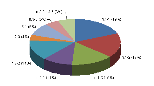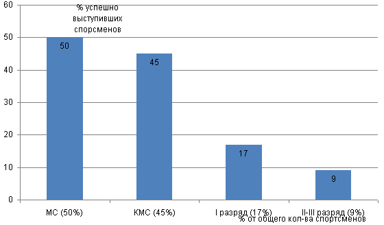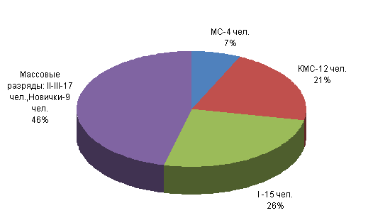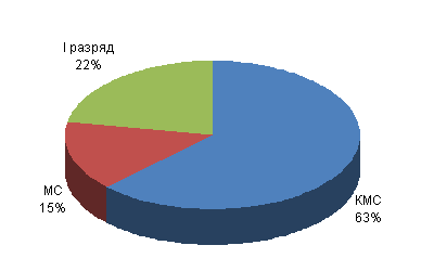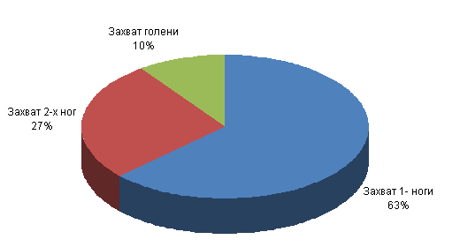Результаты социологического исследования (опрос, анкетирование, тестирование и т.д.), касающиеся анализа причин неудовлетворительной защиты спортсменов сборной команды МГСУ по вольной борьбе от приемов с захватом ног представлены на графиках и диаграммах рис.1-8 [4, 5, 6]. Рис. 1. Качественный состав сборной команды МГСУ по вольной борьбе. Рис. 2. Успехи (занятые места) в соревнованиях МСИ, чемпионатах г. Москвы, российских турнирах. Каждый столбец диаграммы (рис.2) отражает процент от общего количества спортсменов, по группам спортивного мастерства, успешно выступивших в соревнованиях 2011/12 учебного года. 1-3 место - МС (50%) от общего числа МС; 1-3 место - КМС (45%) от общего числа КМС; 3-10 места и далее -I разряд (17%) от общего числа перворазрядников; 10 место и ниже -II- III разряд (9%) от общего числа спортсменов массовых разрядов; Рис. 3. Соотношение атакующих действий противника при проведении приемов с помощью захватов ног.