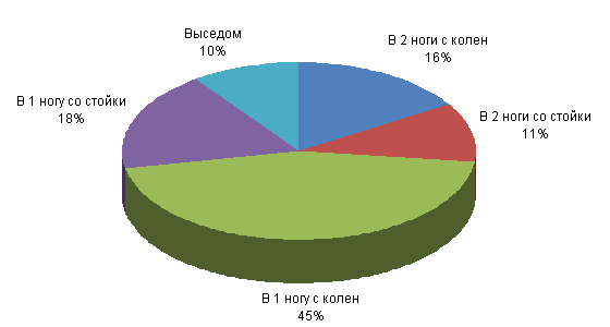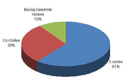 Результаты данного социологического исследования в области анализа слабых мест в технической подготовке спортсменов сборной команды МГСУ по вольной борьбе показали действенность использования такой методики для повышения спортивного мастерства борцов вольного стиля, совершенствования технической и тактической подготовленности, улучшения их спортивных результатов и роста их спортивной квалификации. Наибольшее количество призеров дают КМС. Они приносят львиную долю в общекомандную копилку и являются основой достижения командного успеха. Рис. 9. Распределение призеров соревнований 2011/12 учебного года по спортивному мастерству. Рис. 10. Атакующие приемы противника (по способу выполнения).