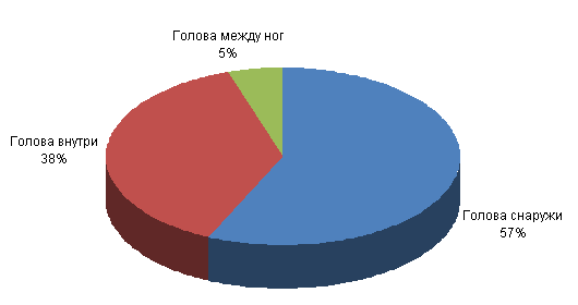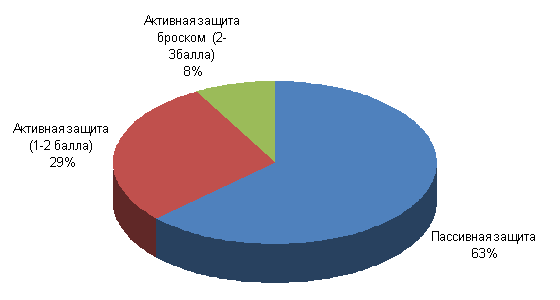Из анализа диаграммы (рис.3) видно, что наиболее распространенным видом атакующих действий противника при проведении приемов с помощью захватов ног является проход в ноги с колен голова снаружи (внутри) с захватом 1ноги. На рис.4 представлено процентное распределение контратакующих приемов, используемых спортсменами МГСУ при проходах противника в ноги. 1. Простые защитные действия (пассивная защита): 1.1.- отбрасывание ног (19%); 1.2.- отжимание головы (17%); 1.3.- разрыв захвата(15%). 2. Контрприемы (активная защита) 1 балл 2.1. - высед (11%); 2.2. - выход сзади соперника прихватом руки(14%); 2.3. - зашагивания, зацепы, сбивания (4%). 3. Сложные активные защитные действия (броски) 2-3 балла: 3.1. - обратный захват туловища (9%); 3.2. - обратный захват дальнего бедра (5%); 3.3. - подхват под одну (две) ногу (2%); 3.4. - прогибом с различными захватами рук, головы, ног (2%); 3.5. - "ножницы" (2%). Рис. 4. Соотношение контратакующих приемов при проходах противника в ноги. Их анализа диаграммы (рис.4) можно сделать вывод, что наиболее часто спортсмены МГСУ используют при проходах противника в ноги контратакующие приемы, которые относятся к простым защитным действиям. Рис. 5. Выбор вида защиты при проходе противника в ноги. Из анализа диаграмм 4 и 5 видно, что при защите от проходов соперников в ноги у спортсменов - борцов МГСУ наиболее распространена пассивная защита - разрыв захвата и уход из контакта с соперником. Наименьшее использование в процентном отношении приходится на сложные, активные контратакующие действия: броски обратным захватом туловища, обратным захватом дальнего бедра, подхватом, прогибом и т.д.