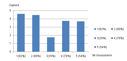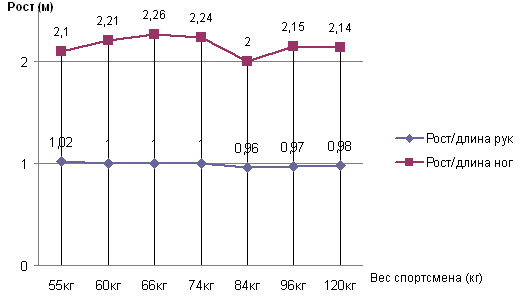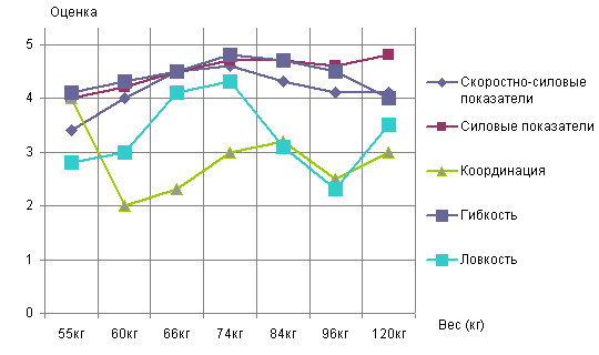 Рис. 6. Распределение физических качеств спортсменов, оцененные по пятибалльной шкале. На рис.6 отражен уровень развития физических качеств спортсменов сборной команды МГСУ по вольной борьбе, исходя из пятибалльной шкалы оценок. 1- скоростно-силовые показатели оценены на 4 и 5 баллов у 92% спортсменов; 2 - силовые показатели - у 89% спортсменов; 3 - координация -у 35% спортсменов; 4 - гибкость - у 78% спортсменов; 5 - ловкость - у 54% спортсменов. Рис. 7. Изменение средних оценок физических качеств спортсменов сборной команды МГСУ по вольной борьбе в зависимости от весовых категорий. Рис. 8. Изменение относительных весоростовых показателей в зависимости от весовых категорий спортсменов сборной команды МГСУ по вольной борьбе. Из анализа графиков, представленных на рис.7 и 8, можно сделать вывод, что характер изменения физических качеств (1-5) имеет тенденцию к повышению в весовых категориях 66,74,84 кг и небольшому снижению (гибкость, координация, ловкость) в весовых категориях 96 и 120 кг. При этом с увеличением веса, а значит и роста, в большинстве случаев относительная длина рук уменьшается, а относительная длина ног, как правило, увеличивается при небольшом снижении в весе 84 кг. В связи с этим, защищаться от проходов в ноги спортсменам сборной команды в весах 66кг и выше, тяжелее из-за индивидуальных весоростовых показателей. Поэтому на отработку приемов защиты от проходов в ноги в этих весовых категориях следует обратить отдельное внимание. При обработке полученного массива данных, анализе построенных диаграмм и графиков, были учтены все переменные, выбранные нами при постановке задачи (в методологической части), выявлены причины неудачных действий: