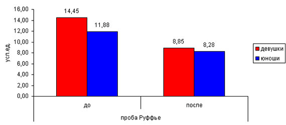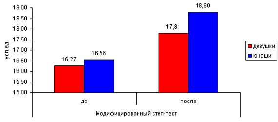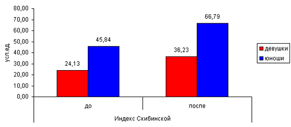 Экспериментальная технология закаливания была рассчитана на 16 недель и предполагала целенаправленную работу на плановых учебно-тренировочных занятиях (УТЗ) по физической культуре, дополнительное посещение бани с КВП (контрастными влажными процедурами) и самостоятельную работу студентов. Всего в рамках реализуемой технологии было запланировано 32 плановых УТЗ по физической культуре, включающих оздоровительное плавание с КВП. А также 16 дополнительных банных процедур с обливанием и не менее 16-ти самостоятельных занятий. В частности анализ результатов пробы Руффье показал достоверные изменения у лиц обоего пола, и, что не мало важно, показатели выросли и у девушек с уровня "плохо" до уровня "хорошо", и у юношей с уровня "удовлетворительно" до уровня "хорошо" (рис.1). Рис. 1. Результаты эксперимента (проба Руффье) Данные модифицированного Гарвардского степ - теста также показали положительную динамику прироста результатов, однако достоверность была выявлена только у юношей (рис.2). Рис. 2. Результаты эксперимента (модифицированный Гарвардский степ - тест) Индекс Скибинской достоверно улучшился и у юношей, и у девушек. Причем достоверность подтверждена критерием Фишера и критерием Стьюдента. Результаты выросли с уровня "удовлетворительно" до "хорошо" у девушек, и с уровня "хорошо" до "очень хорошо" у юношей (рис.3) Рис.3. Результаты эксперимента (индекс Скибинской) Полученные данные свидетельствуют о том, что в результате проведенной ФОТ у студентов улучшилось: - состояние кардиореспираторной системы; - увеличилась работоспособность сердечно-сосудистой системы при физической нагрузке; - поднялся уровень общей физической работоспособности. Таким образом, можно говорить об улучшении функциональной тренированности организма студентов, что не может не сказаться на повышении уровня физической и умственной работоспособности студентов. Мы предполагаем, что использование технологии термогидротреннингов могло бы: