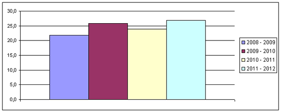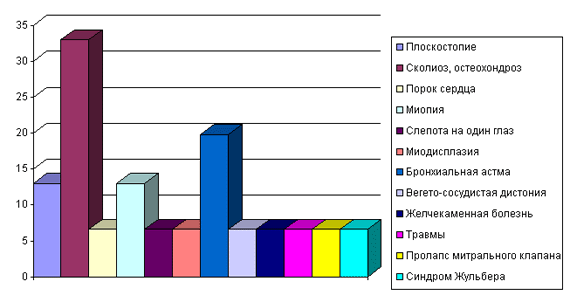Рис. 1. Количество студентов, занимающихся в СМГ Цель, задачи работы, материал и методы. Цель исследования - выявить исходный уровень состояния здоровья студентов I курса строительного университета и разработать систему рекомендаций для дальнейших занятий физической культурой и спортом. Задачи исследования: 1. Определить исходный уровень физической подготовки студентов I курса технического вуза; 2. Определить уровень стресса студентов; 3. Сформировать представление студентов о состоянии своего здоровья; 4. Дать индивидуальные рекомендации для студентов при занятиях физической культурой и спортом; 5. Опираясь на полученные результаты определить дальнейшие перспективы исследования. Методы исследования: 1. Анализ научно-методической литературы; 2. Обобщение передового педагогического опыта; 3. Анкетирование, тестирование. Результаты исследований. Исследование проходило в три этапа, проведенные в сентябре 2012 года. Для получения необходимых данных студентам было предложено ответить на вопросы анкеты, пройти тест на уровень стресса и сдать тесты на определение физической подготовленности. Количество принявших участие - 15 человек 17-18 лет, из них 7 юношей и 8 девушек. Все студенты, принявшие участие в исследовательской работе, отнесены по состоянию здоровья к СМГ (табл. 2). Таблица 2 Заболевания, встречающиеся у студентов I курса