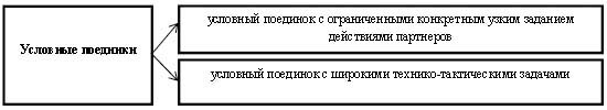 Рис. 1. Классификация условных поединков в боксе ( Согласно И.П. Дегтярёву 1979). На наш взгляд, используемые в научно-методической литературе классификации носят консервативный характер, и сужены к разделению на условные поединки с односторонним задачей, в которых один из спортсменов выполняет атаку, по указанию тренера, а второй - защищается, или защитившись контратакует, и с двухсторонними задачами, в которых спортсмены выполняют атаки и контратаки ограниченные заданиями тренера. Также существует группирование на условные поединки с узко ограниченными действиями партнеров (действия одного партнера ограничиваются только одним ударом в атаке, а действия второго заключаются в каком-то способе защиты от одного удара или контрударе, соединенном с этим способом защиты), и условные поединке с широкими технико-тактическими задачами (состоят из двусторонних действий партнеров, каждый из которых имеет право и атаковать, и защищаться, и контратаковать). Выполнив анализ научно-методических материалов и опираясь на собственный опыт, мы сделали попытку усовершенствовать существующую классификацию условных поединков путем увеличения количества видов (классов) в вышеупомянутых поединках, путем выделения отдельного вида условного поединка, который по нашему мнению не входит ни в один из пунктов классификации. Так, при использовании группирования условных поединков на поединки с односторонним задачей и многосторонними задачами, или на поединки с узко ограниченными действиями партнеров и поединки с широкими технико-тактическими задачами, по нашему мнению, существует переходный вариант, который невозможно отнести ни к первому, ни ко второму пункту в обеих классификациях. Примером является условный поединок, при котором один из спортсменов атакует четко обусловленным тренером технико-тактическим действием или совокупностью действий, а другой - выполняет защитные действия в произвольной форме (по своему усмотрению), или контратакует после определенного наставником приема защиты, ударом или комбинацией на свой выбор, учитывая ситуацию, которая сложилась в настоящее время. Таким образом, при классификации на условные поединки с односторонним задачей и многосторонними задачами появляется промежуточный пункт, который мог быть названным условным поединком с комбинированными задачами (в котором словосочетание "комбинированные задачи" означает одностороннее задание одного из партнеров, и многосторонние другого). А при использовании классификации на условные поединки с ограниченными конкретным узким заданием действиями партнеров и поединки с широкими технико-тактическими задачами партнеров, имеется возможность выделить промежуточным пунктом условные поединки с односторонне-расширенными действиями партнеров, в котором словосочетание "односторонне-расширенные действия" означает узкое ограничение действий одного из партнеров, и значительное расширение технико-тактических задач другого. Но и такая, усовершенствованная, классификация, по нашему мнению, отражает сущность данного методического приема только в боксе. То есть в виде единоборства, в котором спортсмены весьма ограничены в арсенале технико-тактических действий в нападении (согласно, существующих правил соревнований, могут использовать только удары с помощ