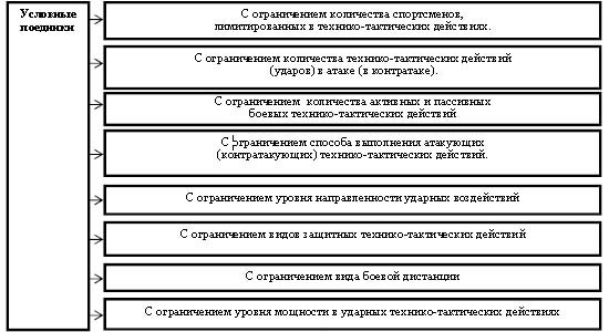 Рис. 2. Альтернативная классификация условных поединков в кикбоксинге. В рабочих программах по кикбоксингу для ДЮСШ такой методический прием, как условной поединок практически не раскрыт, то есть обозначено количество времени, в течение которого кикбоксёры должны практиковать данный приём, но подбор видов условных поединков возлагается на опыт и мастерство тренерского состава. По этому, нами внедряется в практику разработанная программа по совершенствованию технико-тактической подготовленности кикбоксеров с помощью условных поединков на этапе специализированной базовой подготовки, результаты которой будут представлены в последующих работах. Таким образом, используя альтернативную классификацию условных поединков в кикбоксинге, тренер имеет возможность четко определить круг задач каждого из спортсменов, независимо от широты технико-тактических задач, решаемых в данном упражнении. Выводы. Искусственное ограничение боевых средств в условных поединках позволяет не только совершенствовать атакующих или контратакующих боевых действий, но, главное, заставляет кикбоксера находить тактические пути для повышения эффективности этих действий, другими словами - способствует совершенствованию технико-тактических действий в нападении и в защите, и формирует индивидуальную манеру ведения боя кикбоксера. Классификации условных поединков, при которых за основу распределения (группировки) выбрано количественное и качественное ограничение объем технико-тактических действий и их совокупностей, позволяет раскрыть всю многогранность данного методического приема совершенствование уровня технико-тактической подготовленности кикбоксеров, и в полной мере отражает сущность его названия. Литература 1. Атилов А.А. Кик Боксинг Лоу-Кик // А.А. Атилов, Е.И. Глебов. - Ростов-на-Дону: "Феникс", 2002. - 560с. (Серия "Мастера боевых искуств"). 2. Бакулев С.Е. Кикбоксинг: построение тренировки на этапе предсоревновательной подготовки : учебное пособие // С.Е. Бакулев, Г.И. Мокеев, К.В. Шестаков, В.А. Чистяков / - СПб.: Изд-во ЦТЦ СПбГПУ, 2010. - 112 с. 3. Белых С.И. Эффективные методы подготовки кикбоксеров / С.И.Белых // Слобожанський науково-спортивний вiсник : [наук.-теорет. журн.]. - Харкiв : ХДАФК, 2009. - № 3. - С. 332-335. 4. Белых С.И. Усовершенствование тренировочного процесса в ходе подготовки кикбоксеров / С.И. Белых, В.В. Еременко, А.В. Марабян // Слобожанський науково-спортивний вiсник : [наук.-теорет. журн.]. - Харкiв : ХДАФК, 2007. - № 11. - С. 119-122. 5. Горбенко В.П. Особливостi технiко-тактичних дiй у роздiлах кiкбоксiнгу / В.П. Горбенко, О.С. Скирта // Слобожанський науково-спортивний вiсник : - 2012. - №2. - С. 90 - 93. 6. Горбенко В.П. Аналiз змагальноi дiяльностi кiкбоксерiв (WPKA) у роздiлi орiентал / В.П. Горбенко, О.С. Скирта // Спортивна наука Украiни. Науковий вiсник Львiвського державного унiверситету фiзичноi культури. - Електронне наукове фахове видання - часопис: Львiв, ЛДУФК. - 2012. №5 (49). С. 32-38. [Електронний ресурс]. - Режим доступу: http://www.sportscience.org.ua/index.php/Arhiv.html 7. Еганов В.А. Методика обучения защитным технико-тактическим действиям в кикбоксинге : Дис. канд. пед. наук : 13.00.04. - Челябинск, 2005. - 171 с. 8. Жадан А.В. Многоуровневая классификация и систематика технических действий каратэ. / А.В.Жадан // Смоленск. СГАФКСТ Межвузовский сборник научных трудов. - 2008. - № 7. - С. 55-60 9. Калмыков Е.В. Теория и методика бокса: учебник / по