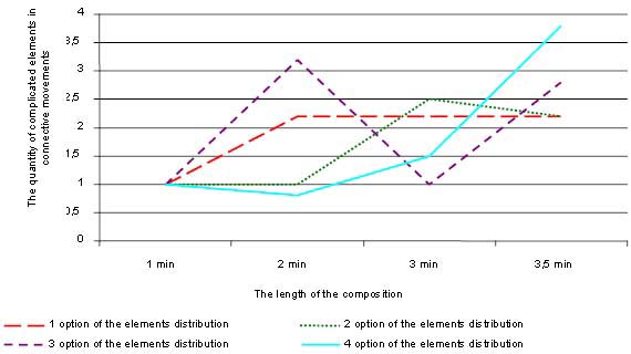 Picture 1. Options of the complicated elements distribution by the minutes of the free routine composition performance. In individual cases, there has been revealed even distribution of combinative intensity over a period of the whole performance. The index of the free routine composition technical complexity is the criterion of the technical preparation, which is a part of sport mastery skills. The criterion of sport mastery skills results in the expected sport outcome. Consequently, the estimate of the free routine composition in the view of its technical performance and the index of its technical complexity which are tightly coupled with each other thus identifying the level of the swimmer’s mastery skills influences sport outcome considerably. On the basis of the analysis of the free routine compositions of the finalists at the World and European Championships in 2008-2011 (n = 32), there were identified by us several main components of the performance estimated by judges: main elements of the composition, connective movements, their complexity and performance quality, artistic impression on the viewers. There was also designed by us the approach to the technical complexity estimation of the free composition (solo performance), which provides for the analysis of the structural elements of the composition. The approach to the freestyle composition estimation designed by us provides for the quantity registration, length of the elements performance and connective movements of the composition, their level of complexity, performance accuracy, elements distribution, movements of different levels of complexity in the composition. The approach to the estimation of the free routine composition technical complexity comprises three main blocks: