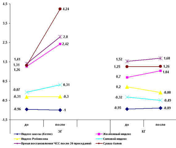 Результаты диагностики свидетельствуют о достоверном улучшении функционального состояния позвоночника студенток ЭГ в ряде применённых проб. В частности, у испытуемых отмечены прирост силовой выносливости мышц спины и брюшного пресса, а также увеличение амплитуды движений в сагиттальной и фронтальной плоскостях. Увеличение гибкости в плечевом поясе обусловило благоприятные изменения в показателях симметричности развития мышечного корсета. Все перечисленные итоговые показатели девушек ЭГ достоверно лучше, чем в КГ (таблица 3). В физическом развитии и физической подготовленности девушек ЭГ выявлены более очевидные положительные изменения, чем у девушек КГ. Согласно результатам тестирования, у большинства испытуемых в ЭГ достоверно увеличились экскурсия грудной клетки, жизненная ёмкость легких, сила, координация. В КГ достоверные позитивные изменения зафиксированы лишь в показателях экскурсии грудной клетки. По большинству показателей результаты девушек ЭГ достоверно лучше, чем в КГ. Функциональная тренированность студенток ЭГ также в целом улучшилась: отмечены достоверные положительные изменения в показателях АД, проб Руффье и Генча, индекса Скибинской, что свидетельствует об улучшении общего состояния кардиореспираторной системы, повышении устойчивости организма к гипоксии, увеличении физической работоспособности. В КГ достоверных улучшений не выявлено. Оценка соматического здоровья испытуемых по методике Апанасенко (1991) позволила установить, что регулярное применение гимнастических упражнений хатха-йоги на занятиях со студентками, имеющими функциональные нарушения позвоночника, способствует достоверному увеличению аэробных возможностей организма, физической работоспособности, силы и, как следствие, общему повышению уровня здоровья. В КГ достоверные положительные изменения выявлены в показателях жизненного индекса, характеризующего аэробные возможности организма, и весоростовых соотношений. По всем показателям, входящим в алгоритм расчета соматического здоровья по методике Апанасенко, за исключением лишь индекса Робинсона, итоговые результаты девушек ЭГ достоверно более положительны, чем девушек КГ. Итоговый общий балл, свидетельствующий об уровне здоровья, в ЭГ составил 4,24±0,29 балла (ниже среднего), в КГ 1,26±0,36 (низкий); различия достоверны (рис. 1). Рис. 1. Уровень соматического здоровья девушек ЭГ и КГ по методике Г.Л. Апанасенко до и после педагогического эксперимента