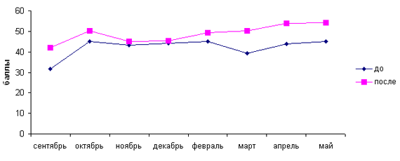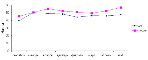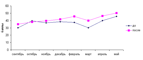 Рис. 2. Динамика самочувствия девушек ЭГ в процессе экспериментальных занятий Регулярное применение на протяжении всего экспериментального периода бланковой методики САН позволило сделать вывод о положительном влиянии упражнений хатха-йоги на самочувствие, активность, настроение испытуемых (рис. 2-4). Рис. 3. Динамика активности девушек ЭГ в процессе экспериментальных занятий Рис. 4. Динамика настроения девушек ЭГ в процессе экспериментальных занятий Проведённые исследования подтвердили выдвинутую гипотезу и доказали, что в занятиях со студентами СМГ, имеющими функциональные нарушения позвоночника, целесообразно применение гимнастических упражнений хатха-йоги, включающих статические и динамические упражнения, способствующие коррекции деформации позвоночника, и дыхательные упражнения, способствующие повышению функциональной тренированности организма. Разработанная экспериментальная методика оказывает положительное влияние на функциональное состояние позвоночника студентов, способствует возрастанию функциональной тренированности, общему укреплению здоровья, улучшению психологического состояния. Выводы.