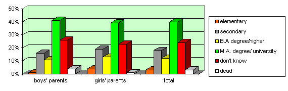 Materials and methods The research included 229 pupils from three Grammar Schools (Forms IA-IIIA) among whom there were 115 girls and 114 boys. The range of respondents’ age varied from 13 to 15 years old. The major research method involves diagnostic poll along with a questionnaire as a research tool. In the research a modified version of Żukowska’s questionnaire entitled " I - my health - sport is used (Academy of Physical Education, Warsaw). The questionnaire consists of three parts. The first part concerns the lifestyle and spending leisure time (seven questions). The second part concerns healthy eating and hygienic/ healthy lifestyle (six questions) and the third part of the questionnaire concerns the need and the importance of physical activity (four questions). In total, the questionnaire consists of 17 both open and close questions. The vast majority of respondents (40%) are children who come from families in which parents graduated from the university (fig. 1). Fig. 1. Education of respondents’ parents, n=229 Results On the basis of the carried out research it has been stated that the level of respondents’ knowledge on the elementary elements of physical activity and health is low (fig. 2). The correct definition of health was given by 37,55% of respondents, 39,30% of respondents appropriately defined recreation, whereas 47,16% of respondents correctly defined sport. More than a half of respondents did not answer or gave incorrect answer to previously mentioned terms. The high level of correct answers concerning the issue of healthy eating (75,55%) and healthy lifestyle (85,15%) was observed in the research. Fig. 2. The level of respondents’ knowledge on physical education (n=229) Only 12,33% of respondents evaluated one’s lifestyle as healthy (fig. 3). The vast majority of respondents’ answers occurred in the range of - rather healthy (39,21%) and rather unhealthy (29,96%). According to the conducted survey, it can be concluded that a small number of gymnasial youth smokes cigarettes (5,67%). The respondents claim that they smoke five cigarettes a day on average. Fig. 3. Own evaluation of lifestyle in term of health by girls and boys (n=229) The survey outcome shows that 38% of respondents spend their leisure time in an active way, whereas 59% of respondents spend their leisure time in a passive way (table 1). It happens more often that boys, rather than girls, prefer spending leisure time in an active way. Table 1 Form of spending free time (n=229)