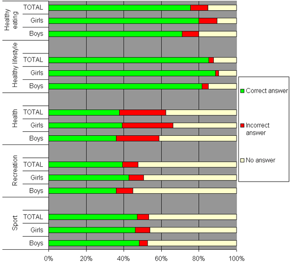 * data shown in per cent ** skiing, skateboarding, tricking, cycling, gymnastics, roller-skating, horse riding, fitness club The respondents also defined the role sport plays in their life. Among the most common aspects of pracising different types of sport are: desire to be better (12,35%), way to be healthy (11,95%), meeting people (11,16%), attractive shape of the body (8,67%) and overcoming own weaknesses (7,57%). Discussion Leisure time is the time which belongs only to a young person. He can devote this time to performing various activities such as: resting, interests, entertainment or socializing. However, the major condition must be fulfilled, namely completing all the tasks and duties connected with everyday life (going to school, doing the homework, helping in the household chores). Unfortunately, this time is more often spent in a detrimental for our organism way. That is why, issues connected with leisure time and forms of spending it were, and still are so important (Kijo 2001; Zawadzka 2001; Cyganiuk and coauthors 2001; Świderska-Kopacz and coauthors 2008). According to Mędrala-Kuder research (20070 leisure time is spent in an active way by half of the respondents, whereas in the surveys conducted by Otręba i Waleczka (2011) only by 42% of respondents. In the hereby research, the author proved that only 38% of gymnasial youth spend their leisure time in an active way. Even if they could decide on their own which activities to choose, the result would increase by only 3%. Among most common passive forms of spending leisure time chosen by boys is watching television and using a computer. Half of male respondents are ready to spend 4 hours a week or even more watching television (Świderska-Kopacz 2008). In case of female respondents the range of passive forms of sending leisure time is much wider. Women enumerate such passive activities as: reading books, listening to music, going for a walk, as well as watching television or using a computer (Mędrala-Kuder 2007; Raglewska and coauthors 2009; Otręba, Waleczek 2011; Świderska-Kopacz and coauthors 2008). The authors in their surveys prove unanimously that these are boys who are more interested in pracising sports in the age between 13-15 years old. Such tendency is observed not only in Poland but also in 22 other countries (Cabak, Woynarowska 2004). It was noticed, both in own research and other authors surveys that physical activity decreases with age among girls and boys of the same age (Świderska-Kopacz and coauthors 2008; Szczęchowicz-Kasza 2007; Cabak, Woynarowska 2004). The most popular among boys are team sports, especially football and cycling (Mędrala-Kuder 2007, Stolaś 2009). When it comes to girls, if they decide to take up some sports, they choose cycling or going for a walk. However, some other surveys show that girls are also keen on practising winter sports as well as roller skating or team sports in the summer. The results of the conducted research correspond with survey carried out by aforementioned authors. Boys most eagerly chose team sports (football, basketball, martial art). However girls were more interested in volleyball, swimming and athletics (especially running). Scientist attended to find the answers to such crucial research issues as why teenagers take up physical exercise and what is the reason for such a low participation in these activities. There are to reasons why teenagers take up physical exercise - health reason and hedonistic reason. The first reason includes teenagers’ desire to take care of their physical fitness, body shape and, of course, health. The second reason includes the desire to have fun and relax which can be combined with meeting friends and socialising (Adamin 2006). The answer to the second question can be found in the works of Medrala- Kuder (2007) and Ręglewska and coauthors (2009). According to these two researchers lack of time and lack of willingness to take up sport is the common factor for such a low activity. Other reasons found in the literature of the subject are following: lack of interests or lack of access to sports facilities. In the author’s of this article research the major cause of not being physically active is the same as in other surveys carried out. Additional answers which appeared was lack of determination and lack of place where teenagers could perform physical exercises. Conclusions General level of respondents’ knowledge on physical education and health must be defined as low (37 - 47% of correct answers). Definitely higher level of respondents’ knowledge was observed within healthy lifestyle (75-85% of correct answers). Gimnasial youth most often choose a passive way of spending leisure time regardless of the fact if the choice is made by them or by their parents. Boys more often choose active forms of spending leisure time comparing to the girls. Physical activity, the development of interests as well as taking care of one’s appearance belong to the group of three activities which take most time for gymnasial youth during the day. Literature 1. Rąglewska P., Urbaniak D., Straburzyńska-Lupa A., Czubaszewski Ł.: Physical activity level in gymnasial youth and the awareness of physical exercise importance in prevention of cardiovascular diseases in the light of questionnaire survey. Fizjoterapia 2009, 17, 2, s. 25-32. 2. Riddoch Ch.: Young and active? Policy framework for young people and Heath- enhancing physical activity. Heath Educ Authority. Londyn 1998. 200 s. 3. Drabik J.: Aktywność fizyczna w edukacji zdrowotnej społeczeństwa (Physical activity In health education of society). Część 1, AWFiS. Gdańsk 1995. 240 s. 4. Drabik J.:Promocja aktywności fizycznej (Promoting of physical activity). AWFiS. Gdańsk 1997. 280 s. 5. Woynarowska B.: Aktywność fizyczna (Physical activity). W: T. Pilch (red.): Encyklopedia pedagogiczna XXI wieku. Tom I A-F, Wydawnictwo Akademickie "ŻAK". Warszawa 2003. 120 s. 6. Sybilski A. J