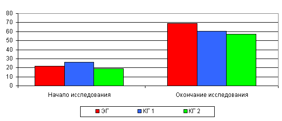 официальные правила игры; методические указания и рекомендации судьям; методика организации соревнований; вспомогательные документы: протоколы, заявки, протесты, календари, отчет судьи о проведении соревнований, объявления, грамоты, поздравительные открытки, рейтинг команд; мультимедийный материал. Внедрение такой технологии изменяет результаты образовательного процесса, создавая при этом усовершенствованные или новые образовательные, дидактичные, воспитательные системы, которые являются необходимыми для качественной учебы и организации соревнований из футбола или другого вида спорта и учебной дисциплины. 9. Зал славы - раздел, в котором отображенные кубки и награды связаны с успехами и достижениями сборной команды академии по футболу. Рядом с указанными изображениями расположены составы команд, получивших соответствующий трофей. Этот аспект является очень важным мотивационным фактором для формирования интереса у студентов к занятиям футболом. В целом это приведет к более качественному преподаванию данного раздела школьной учебной программы в их будущей профессиональной деятельности. 10. Видео - в этом разделе размещены видео игр сборной команды по футболу, интервью с игроками команды, обучающее видео технико-тактическим действиям в футболе, памятные мероприятия, телевизионные программы и другой видеоматериал (события связанные с этим видом спорта в академии, анализ тактических и технических ошибок, достижения в конкретных играх), который содействует обучению, за счет наглядности. Сравнительный анализ материалов исследования засвидетельствовал рост теоретико-методической подготовленности студентов экспериментальной и контрольных группах для работы в общеобразовательных учебных заведениях. В экспериментальной группе средние показатели теоретико-методической подготовленности студентов выросли на 47 %, в контрольной группе 1 - на 34,5 %, в контрольной группе 2 - на 38 %. В сравнении с контрольной группой 1, студенты экспериментальной группы лучше подготовлены на 8,5 %, в сравнении с контрольной группой 2 - на 12 %. Указанная динамика отображена на рис. 1. Рис. 1. Динамика состояния теоретико-методической подготовленности студентов ЭГ - экспериментальная группа, КГ - контрольная группа. В процессе исследования у студентов, которые принимали участие в эксперименте, значительно улучшилось состояние оперативной памяти. Количество студентов, которые имеют низкий уровень развития памяти на образы в экспериментальной группе уменьшился на 16 %, в контрольной группе 1 - на 4 %, в контрольной группе 2 - на 12 % (рис. 2). Рис. 2. Сравнительная характеристика показателей оперативной памяти (на образы) на протяжении эксперимента ЭГ - экспериментальная группа, КГ - контрольная группа. Количество студентов, которые имеют низкий уровень развития оперативной памяти на цифры в экспериментальной группе уменьшилось на 28 %, в контрольной группе 1 -