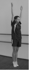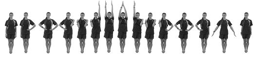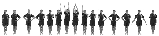 Рис 4. Проба координация Упражнение оценивалась экспертами по десяти бальной системе. За каждое неверно выполненное движение осуществлялась сбавка в 0, 5 балла. После показа упражнения, давалась пробная попытка, после чего упражнение выполнялось на оценку. Исследование уровня развития координационных способностей испытуемых посредством выполнения упражнений на координацию в затрудненных условиях (тест 5, проба координация с прыжками). Выполнение упражнения: из исходного положения основная стойка: 1. Прыжок на двух, левая рука на пояс. 2. Прыжок на двух, правая рука на пояс. 3. Прыжок на двух, левая рука к плечу. 4. Прыжок на двух, правая рука к плечу. 5. Прыжок на двух, левая рука вверх. 6. Прыжок на двух, правая рука вверх. 7 - 8. Два хлопка над головой. 1 - 6. Движение руками выполнить вниз в обратном порядке. 7 - 8. Два хлопки руками по бедрам (рис. 5).
