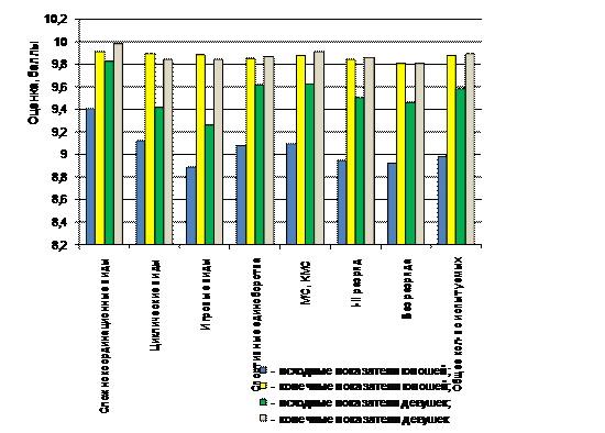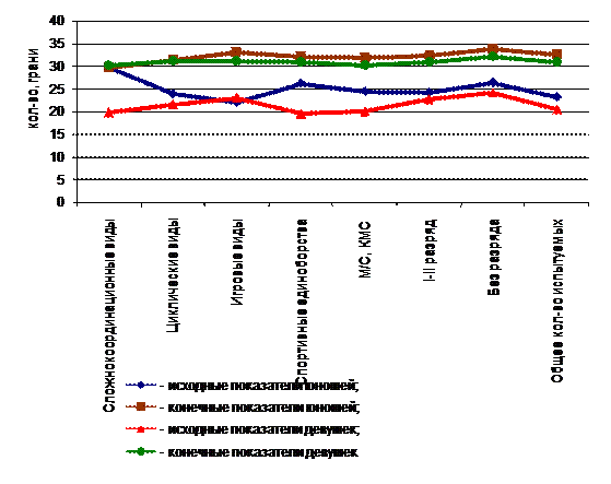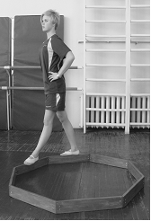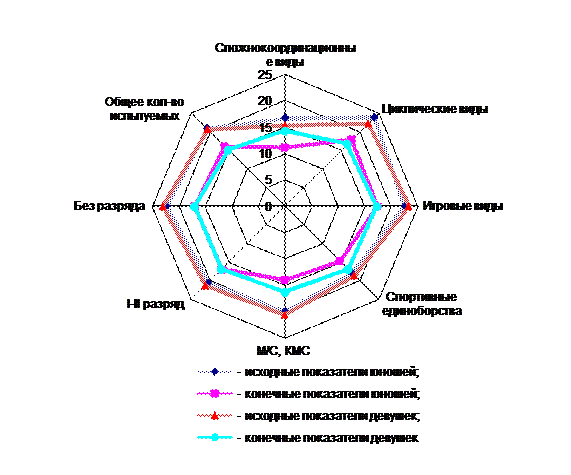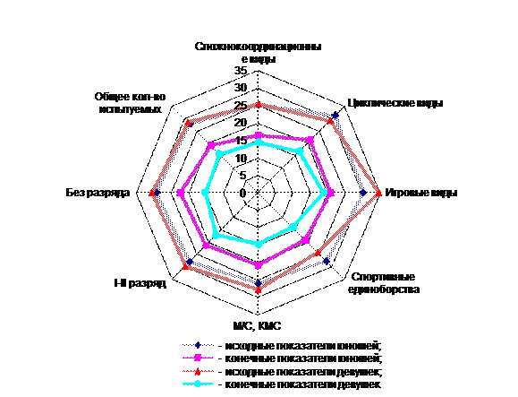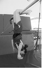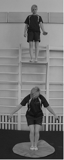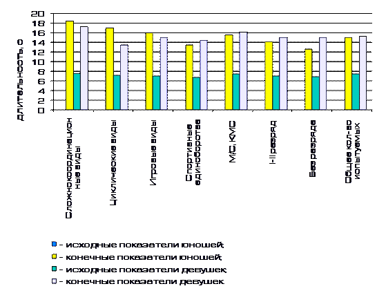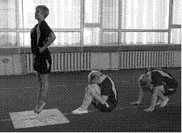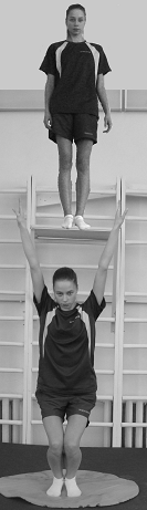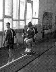 Рис. 5.Проба координация с прыжками Упражнение оценивалось экспертами по десяти бальной системе. За каждое неверно выполненное движение осуществлялась сбавка в 0, 5 балла. После показа упражнения, давалась пробная попытка, после чего упражнение выполнялось на оценку. Исследование устойчивого приземления при выполнении прыжка в глубину (тест 6, проба приземления). Выполнение упражнения: с высоты 3м. выполнить прыжок в глубину выпрямившись на поролоновые маты в центр круга (рис 6). Определялось качество приземления и характер ошибок выполняемых при приземлении по 10 бальной шкале: мелкая ошибка - 0, 2 балла, средняя - 0, 5 балла, падение - 1 балл. Оценка: средняя ошибка трех попыток. Рис. 6. Проба приземления при выполнении прыжка в глубину Исследование пространственной ориентации в условиях относительно кратковременной невесомости (тест 7, проба пространственная ориентировка). Выполнение упражнения: сжать динамометр кистью удобной руки с силой, равной 200 N (девушки - 100 N). Три попытки выполнить со зрительным контролем (запомнить заданное усилие) и три попытки - без зрительного контроля при выполнении прыжка в глубину выпрямившись с высоты 3м на поролоновые маты (рис. 7). Преимущественное раздражение отолитового анализатора. Оценка: средняя трех попыток не должна превышать 10 N. Рис.7. Проба пространственная ориентировка Исследование проприорецептивной чувствительности в измененных условиях гемодинамики и раздражений отолитового анализатора (тест 8, проба проприорецептивная чувствительность). Выполнение упражнения: сжать динамометр кистью удобной руки с силой, равной 200 N (девушки - 100 N). Три попытки выполнить со зрительным контролем (запомнить заданное усилие) и три попытки - без зрительного контроля, при выполнении виса на согнутых ногах на нижней (юноши на верхний) жерди брусьев разной высоты (условия измененной гемодинамики), рис. 8. Оценка: средняя трех попыток не должна превышать 10 N. Рис.8. Проба проприорецептивная чувствительность Исследование динамического равновесия при прохождении периметра многоугольника (тест 9, проба динамическое равновесие). Выполнение упражнения: стать ногой на одну из граней многоугольника, руки поставить на пояс и начать движение по граням. Каждый шаг выполнять только на одну грань, смотреть перед собой (рис. 9). Передвижение осуществляется до первой потери равновесия (движение руками, туловищем, касания ногой опоры). Учитывается количество пройденных граней. Рис. 9. Проба динамическое равновесие Результаты исследований. Полученные исходные показатели сохранения равновесия тела при выполнении теста 1, проба Бирюк студентами первого курса НУФВСУ на занятиях по основной гимнастике свидетельствуют о том, что испытуемые не достаточно хорошо владеют равновесной устойчивостью тела (рис.10). Средне групповое время удержания позы тела составляет 7, 40 - 7, 41с ± 0, 42 - 0, 58с. Показатели времени удержания устойчивого равновесия тела у юношей не имеющих разряда и у юношей игровых видов спорта (6, 12 - 6, 607 ± 0, 51 - 0, 55с). У девушек время удержания позы тела незначительно выше, чем у юношей, но не превышает 7, 5с (6, 75 - 7, 55 ± 2, 10 - 0, 81с). Незначительно лучшие показатели по сохранению устойчивого равновесия тела отмечены у спортсменов сложнокоординационных видов спорта, спортсменов спортивных единоборств и у мастеров спорта (7, 97 - 8, 16 ± 0, 60