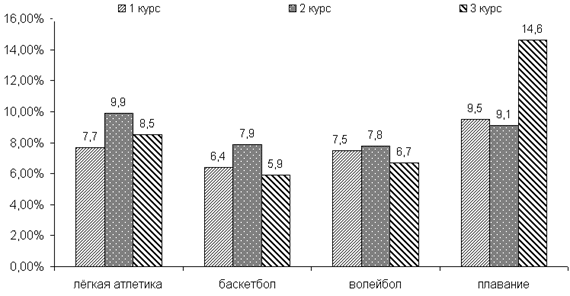 количество студентов СУО, дополнительно занимающихся физической культурой, к старшим курсам, наоборот, увеличивается; интересы студентов ОУО и СУО к видам двигательной активности в основном совпадают; при этом большинство из них привлекают занятия спортивными играми; подавляющее большинство опрошенных на ОУО и СУО желают, чтобы в содержание учебных занятий по физической культуре были включены подвижные игры. Рис. 1. Количество занятий, пропущенных студентами НИУ "БелГУ" в период освоения различных разделов учебной программы по дисциплине "Физическая культура" Серия педагогических наблюдений (всего 10) на УТЗ по физической культуре, проводимых преподавателями кафедры физического воспитания №1 НИУ "БелГУ" , была осуществлена с целью изучения специфики построения процесса физического воспитания студентов СМГ на практике. Полученные данные позволили выделить некоторые общие для СУО тенденции. В частности, УТЗ по физической культуре со студентами с ослабленным здоровьем состоит из трёх частей: подготовительной (20 мин), основной (50-60 мин), заключительной (10-20 мин). Подготовительная часть УТЗ базируется на упражнениях в ходьбе / беге и ОРУ. Основная часть по содержанию может быть весьма разнообразной, что, зачастую, связано с нозологической неоднородностью групп, но, как правило, включает комплексы упражнений на развитие физических качеств и комплексы ЛФК. Заключительная часть УТЗ преимущественно основывается на упражнениях на расслабление мышц и восстановление дыхания. Кривая ЧСС студентов СМГ предполагает достижение значений в 90-110 уд/мин в подготовительной части; повышение до 120-150 уд/мин в основной части; понижение до 90-100 уд/мин в заключительной части. На показатели самочувствия, активности, настроения занимающихся наиболее заметное положительное влияние оказывают аэробика, танцы, йога, подвижные и элементы спортивных игр. Одной из ключевых задач поискового этапа исследования являлось выявление подвижных и элементов спортивных игр, пульсовая стоимость которых в ходе их выполнения студентами с ограниченными возможностями ССС не превышает 150 уд/мин. Параллельно, наряду с выбором игр, заведомо характеризующихся невысокими показателями интенсивности физической нагрузки (пр., "Слалом" , "Удержи палку" , "Ловкий перемах" и др.), велась работа по обоснованию методических приёмов адаптации игровых упражнений с целью понижения их пульсовой стоимости. В результате были отобраны следующие основные приёмы:
