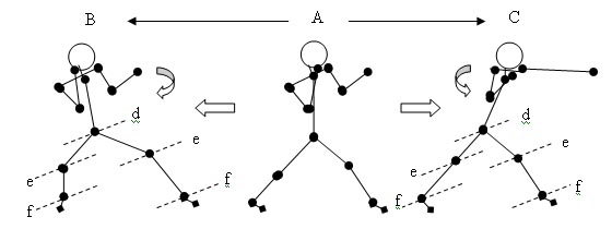 Рис. 1. Схема движения (перемещения веса) туловища при выполнении защиты уклоном назад и контратаки (swaying away and counter attak of straight punch) (стоя на месте) A - исходное положение (боевая стойка); B - положение туловища при выполнении защиты уклоном назад C - положение туловища при выполнение контратакующего удара d - фронтальная ось вращения, проходящая через поясницу и тазобедренные суставы e - фронтальная ось вращения, проходящая через коленный сустав (лев., прав.) f - фронтальная ось вращения, через голеностопный сустав (лев., прав.) На рисунке 1 показано три положения спортсмена: А - боевая стойка (ожидание атаки, удара); В - выполнение защиты перемещением веса тела (уклоном) назад на правую ногу с поворотом туловища вправо; С - выполнение прямого удара рукой в голову с перемещением веса тела вперед и поворотом туловища влево. Когда спортсмен выполняет уклон назад с одновременным поворотом туловища в сторону и перемещением веса тела на сзадистоящую ногу, тем самым он повышает эффективность защиты и, что очень важно, эффективность выполнения контратакующего действия, используя силу упругой деформации мышц, согнутой в коленном суставе ноги, туловища, а также силу реакции опоры. Используя известные данные таблицы определения массы звена тела по его относительной массе в процентах к массе всего тела, были оценены индивидуальные массы звеньев тела спортсменов экспериментальной группы (n=16). Спортсмены выполняли защиту уклоном назад от удара рукой в голову и контратаку - ответный прямой рукой в голову. Выявлено, что результаты отличаются достоверно в трех весовых категориях (до 60, 70 и 75 кг) по сравнению с тремя категориями (до 80, 85 кг и выше) (t = 3,7; Р < 0,01). Здесь очевидны отличия по временным показателям и их зависимость от весовой категории, длины тела в целом и его сегментов. Оценка момента инерции туловища спортсменов (по весовым категориям) при выполнении движения назад- вперед определена по формуле: Ι = ⅓ mℓ2 и были получены следующие результаты: Ι (64κг) = 8,47 кг м2 ; 67кг - 9,28 кг м2; 73кг - 10,11 кг м2 ; 78кг - 11,45 кг м2 ; 85кг - 13,00 кг м2 ; 91кг - 13,92 кг м2 . Результаты эксперимента подтверждают, что имеется выраженная корреляция между ростом, длиной конечностей, амплитудой ударов и моментом инерции. Разница между результатами в весовой категории 64 кг и 91 кг составляет 5,45 кг м2. То есть, антропометрические данные спортсменов (их росто-весовые показатели) влияют на момент инерции, который, в свою очередь, влияет на скорость выполнения преимущественно поступательного движения. Целью очередного эксперимента являлось определение биомеханической характеристики кругового удара ногой с учетом индивидуальных антропометрических данных спортсменов и оценка момента инерции ноги. Так, при выполнении кругового удара ногой (round kick) участники эксперимента (n=16) поднимали колено (бедро) для выполнения удара и осуществляли поворот на опорной ноге под различными углами. "Вынос" бедра колебался от 90 до 5 - 0 о, а поворот стопы опорной ноги от 45 до 180о . В результате анализа техники круговых ударов ногами спортсменами экспериментальной группы была построена модель наиболее оптимальной траектории их выполнения. Так, выявлено, что оптимальный угол между положением бедра, когда колено находится в верхней "мертвой точке" для выполнения "сильного" удара по заданной траектории (в туловище, средний уро
