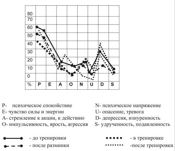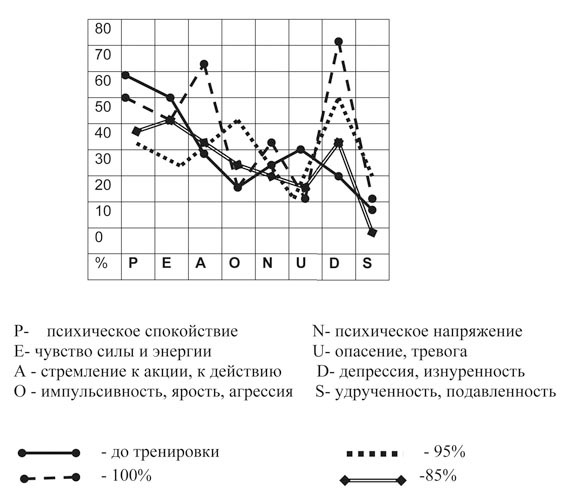 Рис.1. Профиль выраженности состояния на этапах тренировочного занятия пловцов. Эксперимент Б: По результатам исследования личности пловцы были разделены на две группы: хорошо переносящие Болевой Финишный Синдром и остро реагирующие на Болевой Финишный Синдром (7). Результаты в повторно-прогрессивной серии ступенчатого теста показывают, что почти все плов цы боятся плыть тест (рис.2, состояние - U). Но сразу после работы в зоне70-80 % интенсивности снижается тревога, напряжение, идет врабатывание, появляется уверенность. Далее при выполнении работы в зоне 85-90 % интенсивности происходит адаптация. Такая работа носит анаэробно-аэробный, глико литический характер, поэтому важно именно в этих зонах выполнить работу по намеченным результатам, так как здесь усиливается чувство психического беспокойства, тревоги (рис.2, состояние - N - хватит ли сил улучшать время на предстоящих отрезках с 95 и 100 % интенсивностью?). Работа с интесивностью 95 и 100 % тесно связана с психологическим стереотипом двигательной деятельности, в котором доминируют эмоции и ощущения боли, что требует проявления определенных качеств личности - волевого самоконтроля, эмоциональной уравновешенности, психической активности, настойчивости, лидерства. Характерная особенность работы в зоне 95 и 100 % интенсивности заключалась в появлении основного сбивающего фактора - негативных состояний депрессии, чувства изнуренности, апатии, "нулевого накала напряжения", беспомощности. Трое спортсменов отметили наличие жалости к себе с выраженной слезливостью. У двоих пловцов эти состояния, которые можно охарактеризовать как фрустрацию, невозможность вырваться из ситуации, видоизменились в агрессию, направленную на тренера и членов научной группы (рис.2, состояние D). Пловцы с низкой устойчивостью к БФС уже в зоне 90 - 95 % интенсивности начинают отказываться от работы или ак тивно (состояние О) или пассивно, имитируя крайнюю степень утомления, не подтвержденную результатами биохимического анализа. Общее снижение затрагивает ощущение психического благополучия (бодрость, отсутствие тревоги) и чувство силы и энергии (энтузиазм, чувство свободы) - рис.2, состояния P, E. А в зоне 100 % у них катастрофически возрастает раздражительность, страх боли, депрессия, чувство изнуренности и жалости к себе. Резко возрастало количество мотивирующих контактов со стороны тренеров. Сравнительный анализ динамики осознаваемых и не осознаваемых компонентов психического состояния в зоне БФС показал, что спортсмены полностью осознают и контролируют свои действия. Даже при агрессивно-истерических отказах продолжать работу, они её всё равно выполняли. Подобное поведение приобретало ритуальный характер у пловцов с демонстративным типом личности. Любопытно, что никто не называл страх боли в числе причин отказа во время работы.