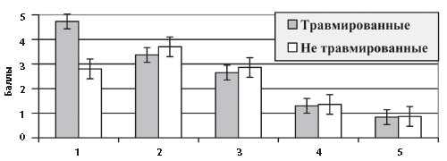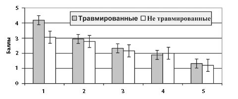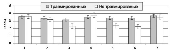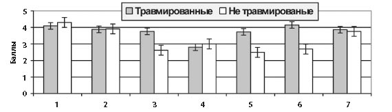 1 - интерес к тренировкам, 2 - работоспособн., 3 - агрессивн., 4 - эмоц. устойчив., 5 - не умение концентр. внимание, 6 - тревожность, 7 - усидчивость Показатели в группах травмированных и не травмированных спортсменов имели следующие оценки: интерес к тренировочному занятию - 3,58 и 3,62 балла (p > 0,05); физическая работоспособность - 3,39 и 3,23 балла (p > 0,05); агрессивность - 3,20 и 2,36 балла (p < 0,05); эмоциональная устойчивость - 3,54 и 3,79 балла (p > 0,05); неумение концентрировать внимание - 3,42 и 2,37 и балла (p < 0,01); тревожность - 3,42 и 2,27 балла (p < 0,001); усидчивость - 3,70 и 3,54 балла (p > 0,05) соответственно. Таким образом, различия между группами травмированных и не травмированных спортсменов 12 - 14 лет выявлены по показателям агрессивности, неумения концентрировать внимание и повышенной тревожности. Сравнение личностных показателей в двух группах (получившие травмы различной тяжести и не травмированные) у юных спортсменов 15-16 лет выявило следующее (диаграмма 2). Показатели в группах травмированных и не травмированных спортсменов имели следующие оценки: интерес к тренировочному занятию - 4,09 и 4,30 балла (p > 0,05); физическая работоспособность - 3,88 и 3,91 балла (p < 0,01); агрессивность - 3,76 и 2,62 балла (p < 0,001); эмоциональная устойчивость - 2,80 и 3,00 балла (p < 0,001); неумение концентрировать внимание - 3,73 и 2,49 балла (p < 0,001); тревожность - 4,15 и 2,69 балла (p < 0,001), усидчивость - 3,86 и 3,76 балла (p > 0,05) соответственно. Диаграмма 2 Личностные показатели травмированных и не травмированных спортсменов 15-16 лет