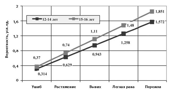 Разработка метода косвенного прогно зирования возникновения у спортсме нов 12-16 лет травм с различной степенью вероятности Для косвенного прогнозирования возникновения у спортсменов 12 - 16 лет травм с различной степенью вероятности использован совокупный показатель уровня сформированности личностных характеристик, имеющих наибольшие корреляционные связи с травмами различной тяжести. Совокупный показатель выводится как сумма произведений уровней личнос тных показателей, умноженный на коэффициент корреляции каж дого показателя с уровнем тяжести травмы. Формулы для прогностической оценки возможного получения травмы различной тяжести имеют следующий вид: СП 12-14 = УА х 0,244 + УНКВ х 0,319 + УТ х 0,331 + УМСЛ х 0,215 СП 12-14 = УА х 0,299 + УНКВ х 0,337 + УТ х 0,314 + УМСЛ х 0,255 Где: СП 12-14 - совокупный показатель для спортсменов 12-14 лет; СП 15-16 - совокупный показатель для спортсменов 15-16 лет; УА - уровень агрессивности; УНКВ - уровень неумения концентрировать внимание; УТ - уровень тревожности; УМСЛ - уровень мотива самоутверждения любой ценой. Корреляционный анализ показал, что теснота связи между вычисленными совокупными показателями (СП) и возможностью возникновения спортивной травмы различной тяжести составляет у спортсменов 12 - 14 и 15 - 16 лет соответственно 0,754 и 0, 799, что значительно превышает коэффициенты корреляции каждого отдельно взятого личностного качества. Стало очевидным, что изменения личностных качеств не могут возникнуть и исчезнуть, не отразившись в соответствующих функциональных структурах [4]. На основании полученных данных представлен график с двумя зависимостями, которые демонстрируют возможность получения спортивной травмы разной тяжести в зависимости от уровня сформированности выделенных личностных качеств 12 - 14 и 15 - 16 летних спортсменов (диаграмма 5). Диаграмма 5. Вероятность получения спортивной травмы разной тяжести в зависимости от уровня сформированности выделеных личностных качеств