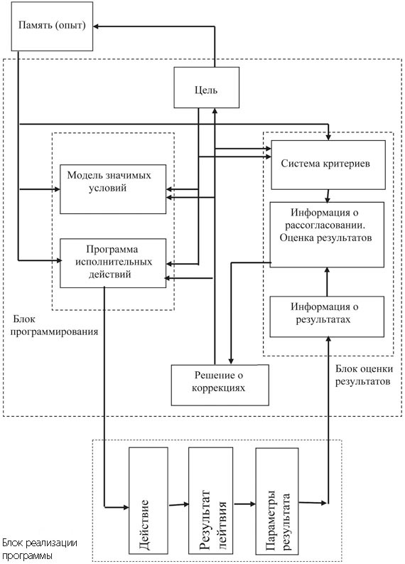 Рис.1. [11, c.37], [12, с.25 ] Функциональная структура процесса саморегуляции деятельности При прочих равных условиях выигрывает тот спортсмен, который умеет регулировать свое психофизиологическое состояние, уравновешивая процессы торможения и возбуждения до уровней, наиболее благоприятно влияющих на технику выполнения выстрела. Регуляторная функция цели деятельности может быть представлена в наиболее общем виде как сис темообразующая функция, благодаря которой весь процесс саморегуляции приобретает определенное направление. Результаты показали, что постепенно по мере формирования в психологической системе деятельности по саморегуляции состояния выделяются все компоненты, характерные любой деятельности [6]. Структура системы осознанного целенаправленного саморегулирования трудовой деятельности реализуется такими функциональными звеньями, как "принятая субъектом цель деятельности" (цель), "субъективная модель значимых условий деятельности" (модель условий), "программа собственно исполнительских действий" (программа), "система критериев успешности деятельности" (критерии успеха), "информация о реально достигнутых результатах" (информация о результате), "принятие решения о коррекциях" [11, 12]. (Рис. 1). Умение создать у себя психическое состояние, благоприятствующее ведению стрельбы, сохранить тонус оптимальных напряжений на всем протяжении выполнения упражнения - одна из важных сторон спортивного мастерства стрелка высшего ранга. Стрелок, находясь в фазе оптимальной активности, способен сам правильно оценить свое состояние, он может распознать симптомы, сигнализирующие об утомлении, перевозбуждении или о хорошей нервно-мышечной готовности. Таким образом, от состояния психики, умения управлять собой зависит во многом успех выступлений в соревнованиях. Следовательно, психологическая подготовка спортсмена имеет такое же большое значение в его спортивном совершенствовании, как физическая, техническая и тактическая подготовка. Литература: 1. Алексеев А. В. Себя преодолеть! - 3-е изд., перераб., доп. - М., 1985. 2. Вяткин Б. А. Управление психическим стрессом в спортивных соревнованиях. - М., 1981. 3. Ганюшкин А. Д. К вопросу о технологии психологической подготовки спортсмена// Спортивная психология в трудах отечественных специалистов/сост. и общ. ред. И. П. Волкова. - СПб., 2002. 4. Голубев Р. А. Еще раз о спортивном аутотренинге. - Мн., 1991. 5. Горбунов Г. Д. Психопедагогика спорта. - М., 1986. 6. Дикая Л. Г. Становление нервной системы психической регуляции в экстремальных условиях деятельности//Психические состояния/Л. Г. Дикая. - СПб., 2000. 7. Ильин Е. П. Теория функциональной системы и психофизиологического состояния // Психические состояния. - Спб., 2000. 8. Косов Б. Б. Принципы изучения психических состояний и проблема саморегуляции деятельности спортсмена / Психология и современный спорт: Международный сборник научных работ по психологии спорта/Сост. А. В. Родионов, Н. А. Худадов; Предисл. М. Ванека. - М., 1982. 9. Коупман Р. Гипноз: практическое руководство. - СПб., 1998. 10. Найдиффер Р. М. Определение и формирование оптимального уровня эмоционального возбуждения./Стресс и тревога в спорте: Международный сб. Научных статей./Сост. Ю. Л. Ханин. - М., 1983. 11. Нерсесян Л. С. Психологические аспекты повышения надежности управления движущимися объектами. - М., 1992. 12. Нерсесян Л. С., Кон