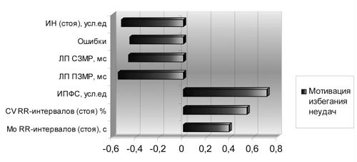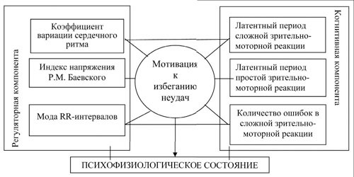 Рис. 1. Корреляция между показателями, характеризующими психофизиологическое состояние и мотивацией к избеганию неудач Исходя из этого, можно подытожить, что группа спортсменов с сочетанием высоких уровней мотиваций характеризуются состоянием относительной уравновешенности с внешней средой, поскольку здесь высокая приспособляемость к разным условиям достигается при минимальном напряжении регуляторных систем. Спортсмены, которые входят в первую группу характеризуются большей адаптивностью благодаря экономичности регуляции при достаточно высоких показателях простой и сложной зрительно-моторной реакции сравнительно с группами 2 и 3. По данным литературы, латентные периоды времени реакции являются информативными пока зателями деятельности функциональных систем мозга [4]. По ошибочным реакциям можно судить о деятельности систем внимания и оперативной памяти [11]. Магомед-Еминов М. Ш. [12] определяет мотивацию как функциональную систему интегрированных аффективных и когнитивных процессов, которая регулирует процесс деятельности в ситуации достижения на протяжении всего времени ее осуществления. Можно сказать, что в данном случае мотивация к избеганию неудач является фактором формирования когнитивно-регуляторной системы обеспечения деятельности, а результатом этой деятельности является психофизиологическое состояние спортсмена (рис. 2). Поскольку изменение вариабельности сердечного ритма является реакцией ритма сердца на динамику нервно-эмоционального состояния человека [5,14], то можно говорить, что мотивация к избеганию неудач является регулятором напряженности психофизиологических систем на основе данных корреляционного анализа, который обнаружил положительную связь мотивации к избеганию неудачи с показателями напряженности системы регуляции как Мо и СV и отрицательная связь с индексом напряжения (по Р. М. Баевскому [2]), что согласовывается с результатами исследований других ученых [20]. Согласно анализу литературных источников и полученными данными, можно предположить, что мотивация к достижению успеха ответственна за активацию симпатического отдела вегетативной нервной системы, а мотивация к избеганию неудач - за активацию парасимпатичного отдела (это можно объяснить прямой корреляцией мотивации к избеганию неудач и модой RR-интервалов, которая указывает на эффект влияния на синусовый узел сим патичного и парасимпатичного отделов, а также недостоверным уменьшением соотношения LF/HF во второй группе с незначительным преобладанием мотивации к избеганию неудачи и увеличение у третьей группы, у которой мотивация на достижение доминирует (показатель указывает на соотношение симпатического и парасимпатического действия на синусовый узел сердца). В этом случае мотивация к избеганию неудач является фактором, регулирующим психофизиоло гическое состояние спортсмена - при высоком уровне мотивации к достижению высокий уровень мотивации к избеганию неудач обеспечивает снижение уровня напряженности регуляторных систем организма и обеспечивает достаточно высокую скорость переработки информации - при сохранении стойкой установки на достижение цели. Цель как ожидаемый и желательный результат деятельности нуждается в постоянном напряжении сил. Человек, который стремится к достижениям, постоянно пере