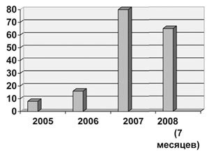 Рис. 1. Количество учебно-тренировочных сборов, на которых осуществлялось психологическое сопровождение подготовки к ОИ-2008 Приведенные на рисунке 1 данные свидетельствуют о заинтересованности в психологической подготовке. Несмотря на это, увеличение количества У ТС, в которых принимали участие психологи, не принесло качественно нового результата в процессе психологического сопровождения спортсменов. Причиной этого, на наш взгляд, явилось отсутствие системообразующего подхода в организации работы психологической службы. В настоящее время психологическая с лу жба в спорте представляет собой разрозненные с трук т урные подразделения, между которыми отсутствует налаженное взаимодействие, нет четкого определения границ профессиональной компетенции и обоснованности применения методик воздействия. Такая несогласованность взглядов не позволяет выйти на качественно новый уровень психологического обеспечения максимального спортивного результата, поскольку каждый практикующий психолог вынужден основываться на личном представлении об эффективной деятельности. Ниже хотелось бы обратить внимание на ключевые моменты, с которыми, так или иначе, сталкивается спортивный психолог в своей профессиональной деятельности. 1. Взаимодействие в системе "тренер-спортсмен-психолог" Эффективность психологической работы достигается при условии, когда психолог и тренер с одной стороны становятся единомышленниками, а с другой - четко различают свои функции и возможности. Работа психолога направлена на оптимизацию взаимоотношений в системе "тренер-спортсмен". Работа психолога должна быть направлена на обучение спортсмена самостоятельному регулированию неблагоприятных психических состояний в тренировочной и соревновательной деятельности. Вместе с тем, тренер, и спортсмен не всегда могут объективно оценить предстартовое состояние. Однако, в настоящее время психолог вынужден в своей работе ориентироваться на субъективную оценку тренера и спортсмена, что далеко не всегда приводит к оптимальному результату. В спорте высших достижений психолог должен иметь возможность изучать поведение спортсменов на крупных международных стартах в целях оптимизации и индивидуализации процесса психологического сопровождения. Необходимо отметить в ряде случаев отсутствие у тренеров и спортсменов четкого представления о деятельности психолога, вследс твие чего происходит недооценка или переоценка его возможностей. Таким образом, существует острая необходимость в организации планомерной работы по психологическому просвещению, направленной на достижение оптимального взаимодействия в системе "тренер-спортсмен-психолог". 2. Оценка эффективности деятельности психолога в спорте На данный момент отсутствуют объективные научно-обоснованные критерии оценки деятельности спортивного психолога. Часто психолог привлекается для работы с командами, где нет высоких спортивных результатов, что может быть обусловлено и недостатками в других видах подготовки. Степень эффективности работы психолога оценивается тренером, который не имеет достаточной квалификации в области психологии. Здесь хотелось бы привести аналогию с работой тренера: из 10 спортсменов, с которыми он работает только один становиться олимпийским чемпионом, но это не являетс