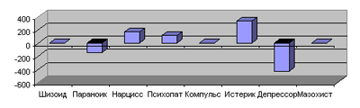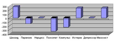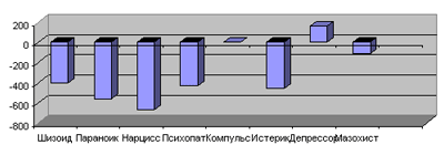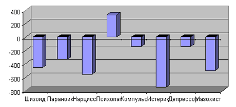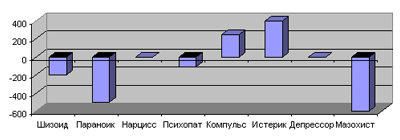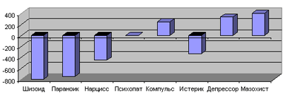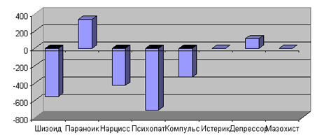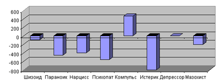 Приведем аннотацию основных цитируемых в литературе особенностей различных ТХ. ШИЗОИДНЫЙ ТХ: креативность, фантазии, идеи, неприхотливость, интеллектуально -эстетические увлечения, хорошая память, утомление от интенсивных контактов, некоммуникативность, узость круга деятельности, замкнутость, неблагодарность, черствость, отступление от социальных норм, возможная жестокость, отстраненность от практической жизни, нетребовательность, нет честолюбия, упрямство, отпор агрессии. ПАРАНОИДАЛЬНЫЙ ТХ: подозрительность, ожидание худшего, честолюбие, предрассудки, пренебрежение к другим людям, ревность, неуживчивость, целеустремленность, верность флагу, с легкостью нарушают законы, завышенная самооценка, перекладывают ответствен на других, легко обижаемы, ранимы, уважение проявлениям силы и власти. НАРЦИСТИЧЕСКИЙ ТХ: завышенная самооценка, не воспринимают людей как личностей, нет эмпатии, завышенные притязания славы, стремление эксплуатировать чужой труд, высокомерное поведение, требование преклонения, зависть, управленческие способности, претензии на льготное приоритетное положение. ПСИХОПАТИЧЕСКИЙ ТХ: антисоциальное поведение, безответственность, агрессивность, раздражительность, лидерские качества, нестабильность отношений, бессердечие, лживость, отсутствие "комплексов", стремление манипулировать другими, поиск острых ощущений, неспособность обучатся на собственном опыте, завышенная самооценка, уверенность в правомерности поведения. КОМПУЛЬСИВНЫЙ ТХ: педантизм, условности; мечтательность, бескомпромиссность, отсутствие чувства юмора, бережливость до скупости, авторитарность, мало друзей; живость общения; работоспособность; приоритет работы над семьей; нерешительность. ИСТЕРИЧЕСКИЙ ТХ: требование внимания, раздражительность, ранимость, внушаемость, эгоизм, завышенная самооценка, честолюбие, энергетичность поведения, поиск возбуждающих эмоций, поверхностность, нестабильность отношений, необходимость помощи в снятии возбуждения. ДЕПРЕССИВНЫЙ ТХ: несамостоятелен, не волевой, не может противостоять давлению, нетребователен, мобильность, энергичность, общительность, переключаемость, низкая самооценка, завышенные требования к себе, боязнь одиночества, агрессия, ранимость, деликатность, эмпатия, доброта, неинициативность, медлительность. МАЗОХИСТИЧЕСКИЙ ТХ: терпимость, вера в лучшее будущее, низкая самооценка, необходимость повышения самооценки, ранимость, некоммуникативность, утомляемость, покорность, безрадостность, избирательность контактов. Теперь для каждой пары ТХ создадим таблицу, по одному направлению которой будут откладываться приведенные выше особенности одного ТХ, а по другому направлению - другого ТХ. В месте пересечения будем проставлять три оценки: -1; 0; +1 в зависимости от позитивности и негативности отношений. Итоговая оценка по всему полю формировалась из баланса N(+) и N(-). Это было число (N(+) - N(-))×1000/ (N(+) + N(-)). Результаты представлены в виде диаграмм: