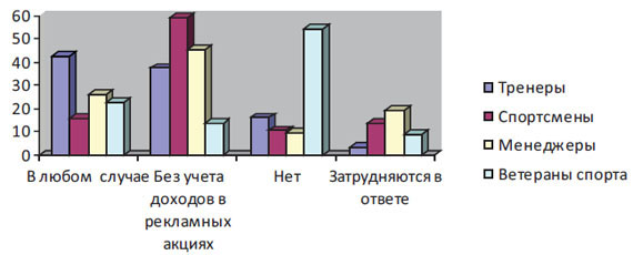 Рисунок 2 - Общественное мнение о правовой трактовке основ деятельности в институте спорта в стране, % Чаще всего затруднения вызывают у субъектов института спорта момент, когда речь идет о смене гражданства и при переходе из одного государственного клуба в другой государственный клуб, а также из государственного клуба в коммерческий. Согласно исследованию спортсмены подходят к выполнению условий контракта более ответственно, по сравнению с тренерами и спортивными менеджерами. Среди них гораздо больше тех, кто считает уход из спорта без форсмажорных обстоятельств невыполнением условий контракта - соответственно 75,4%, 61,7% и 65,9% этих контингентов. Анализ ранговой структуры факторов, которые должны определять сумму спортивного контракта показал, что практически все субъекты института спорта в качестве главного определяющего фактора отметили "одаренность и перспективность спортсмена (1 ранговая позиция из 12), тогда как сами спортсмены считают главным критерием, определяющим заключение контракта - спортивные заслуги. Следует отметить, что этот фактор у других субъектов спорта не вошел даже в число пяти ведущих. Несколько настораживает тот факт, что состояние здоровья спортсмены поставили на пятое место в структуре двенадцати предложенных факторов. Гораздо важнее для них оказались - "мнение (рейтинг) специалистов", "спортивное звание". Это сви детельствует об отношении спортсменов к своему здоровью, что убеждает нас в приоритете для этого контингента цели перед средствами ее достижения. Принимая во внимание тенденцию "омоложения" спорта, следует обратить внимание на научно обоснованные, психологически и биологически оправданные возрастные зоны начала занятий спортом, которых следует придерживаться в практической деятельности. Эксперты считают, что в 70% случаев возраст начала занятий спортом стабилен и что спортсмены, рано приступившие к тренировкам, за больший срок осваивают норматив мастера спорта, а спортсмены, начавшие тренироваться в более позднем возрасте, быстрее осваивают этот норматив. Следовательно, начало занятий спортом в более раннем возрасте не ускоряет процесса подготовки, но значительно удорожает его и не гарантирует стабильных результатов. При анализе результатов оптимального времени для заключения первого контракта в разных группах видов спорта обращает на себя внимание, что в сложно-координационных видах спорта респонденты считают оптимальным временем заключения контракта начало выступления спортсменов в коммерческих турнирах (1ранг). Однако при этом нельзя оставлять без внимания, что первые турниры в гимнастике и фигурном катании, как правило, приходятся на возраст, когда спортсмены еще не достигли совершеннолетия. И здесь есть над, чем подумать спортивным менеджерам и юристам. Наиболее часто ратует за заключение контракта с несовершеннолетними спортсменами тренерский корпус - 53,7% респондентов, а также спортивные менеджеры - 46,8% опрошенных, тогда как всего четверть спортсменов считает возможным заключение контракта с родителями несовершеннолетнего спортсмена и около половины из них указывают на нецелесообразность такого подхода. Отношение к принципам заключения контракта с несовершеннолетними спортсменами должно основываться не только на согласии на этот акт со стороны их родител