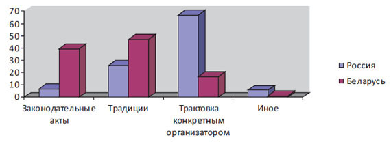 Показательны позиции контингента при обраще нии к вопросу о правах государства требовать материальную компенсацию за подготовку спортсмена при смене им гражданства и желания выступать за "новую родину". Если больше половины менеджеров (65,3%) и тренеров (59,5%) считают необходимым прописывать в контракте такой момент, то только один из пяти спортсменов выразил согласие с этим положением. Правда надо отдать должное тому, что среди спортсменов высокой квалификации в два раза больше придерживается такой позиции по сравнению с менее квалифицированными. Тем не менее, больше половины спортсменов не считает необходимым выплачивать материальную компен сацию за свою подготовку государству при смене гражданства - 53,8% опрошенных. Сопоставительные данные относительно необходимости возмещения государству спортсменами компенсации за их подготовку, свидетельствуют не в пользу российской системы подготовки, субъектов института спорта к современным условиям правового регулирования отношений в спорте. Среди них, согласных с этим тезисом, в два раза меньше по сравнению с белорусами - соответственно 23,9% и 46,2% опрошенных. И это не удивляет, так как только 6,8% опрошенных субъектов института спорта в России считают, что деятельность в отечественном спорте осуществляется на основе законодательных актов, тогда как среди белорусов так считают 39,0% респондентов (рис.2). Нацеленность на приоритет закона диктует нацеленность на необходимость законодательного закрепления "института спортивных переходов". Так, большинство субъектов института спорта считает необходимым законодательно жестко закрепить правила перехода спортсменов из клуба в клуб в системе коммерческого спорта -72,3% опрошенных, из государственного спорта в систему коммерческого - 74,8%, а также при смене гражданства - 71,4% респондентов.