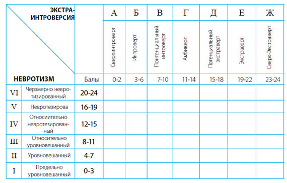 Градации темпераментов (модификация Ю.К.ГавердовскогоСонг Ю Чжина). Применяя подбную модификацию шкалы Г.Ю. Айзенка, можно более детально и гибко иденти фицировать психические свойства спортсмена, используя при этом - и это главное - доступные тренеру-непсихологу вербальные ключи. Ниже приводятся примеры применения вербализованного ключа для оценки компонентов психики спортсменов, прежде всего, по степени выраженности двух основных признаков, определяющих темперамент испытуемого по 24-балльным шкалам невротизма и экстра-интроверсии, согласно общему принципу Г.Ю. Айзенка. Пройдя тест Айзенка и определившись по этим признакам, спортсмен и его ученик могут получить не только представление о темпераменте спортсмена, но и установить "зону" своего темперамента. В свою очередь, используя вербальные ключи невротизма и экстроинтроверсии также возможна идентификация темперамента, исходящая непосредственно от тренера: руководствуясь своими наблюдениями за учеником, тренер может выбирать "готовые" вербальные градации невротизма и экстра-интроверсии, наиболее соответствующие, как ему представляется, психотипу ученика, обращаясь затем к предложенному определению темперамента с учетом его "зоны". Вербальный ключ к шкале невротизма. I. 0-3 балла. П р е д е л ь н о у р а в н о в е ш е н н ы й. Практически невосприимчив к раздражителям, "толстокожий", внешне непроницаемо спокоен. Прекрасное самообладание, выдержка. Весьма решителен в исполнении задуманного, вплоть до самоуверенности. Тенденция к настойчивому удовлетворению потребностей типа "все равно хочу!". Очень терпелив при неудачах, флегматичен, иногда инертен. Способен активно мобилизоваться в стрессовых ситуациях. II. 4-7 баллов. У р а в н о в е ш е н н ы й. Невозмутим в трудных ситуациях, владеет собой, хладнокровен, стабилен в реакциях. Действует уве ренно, спокойно, не суетно. Терпеливо выносит трудности и раздражающие обстоятельства. В стрессовых ситуациях умеет себя контролировать. III. 8-11 баллов. О т н о с и т е л ь н о у р а в н о в е ш е н н ы й. Нормально восприимчивый и достаточно уравновешенный тип. При затруднениях обычно способен собой владеть и преодолевать возникающие сомнения. В поведении и реакциях сдержан, мягок, порой оживлен. В случаях возникновения стресса испытывает напряжение, но обычно может его преодолевать. IV. 12-15 баллов. О т н о с и т е л ь н о н е в р о т и з и р о в а н н ы й. Весьма чувствителен, отзывчив. Склонен к волнению, самоконтроль требует определенного напряжения. В трудных ситуациях испытывает колебания и в действиях не всегда уверен. Эмоционален, любит жестикулировать. Экстравертированные типы в конфликтных ситуациях склонны фиксироваться на препятствии, обвиняя в неудаче других (экстрапунктив ность). Интроверты в той же ситуации более сдержанны, склонны к впечатлительности и самоанализу. В стрессовом состоянии те и другие могут терять самообладание и ориентировку, но в принципе дееспособны. V. 16-19 баллов. Н е в р о т и з и р о в а н н ы й. Легко возбудим и раздражителен. В поведении неустойчив. Из-за неуверенности в себе часто теряет самоконтроль. Чрезмерно эмоционален, вспыльчив, чувствителен к обиде, раним. Реакции часто неадекватны по силе. В стрессовых ситуациях излишне возбужден или, напротив, подавлен. Организованно действовать в стрессовой ситуации не умеет. VI. 20