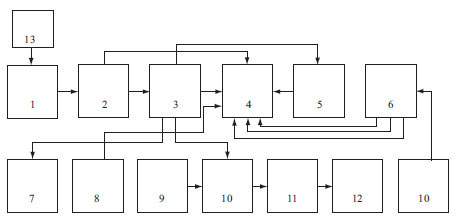 Рис. 1. Блок-схема тренажерно-исследовательского стенда: 1 - катапульта; 2 - фотоэлектронное устройство; 3 - блок задания игровых комбинаций; 4 - блок измерения временных параметров; 5 - блок задержки предъявления игровых комбинаций; 6 - блок контактных датчиков для рук при ударе по мячу; 7 - блок тиристорных пускателей; 8 - блок предъявления заданий; 9 - блок контактных датчиков для оценки точности передачи мяча в мишень; 10 - блок оценки; 11 - блокраспределитель; 12 - цифропечатающее устройство; 13 - блок питания. Катапульта представляет собой динамическое электромеханическое устройство, в котором качание гнезда для мячей и взведение пружины про исходят от электропривода, а выброс мяча осуществляется силой сжатой пружины. В катапульте использован жесткий программоноситель в виде распределительного вала. На одном его конце установлен кривошипно-шатунный механизм с криво шипом, длина которого изменяется от 0 до 100 мм. На другом конце распределительного вала смонтирована ведущая звездочка транспортера, с помо щью которой взводится пружина. Расположение "собачек" на цепи транспортера, взводящих и спускающих боек катапульты, рассчитано таким образом, что выброс мяча происходит в произвольном положении ствола катапульты. При работе катапульты в программном режиме мячи разбрасываются в секторе 30°. При выводе кривошипа узла качания в нулевую точку угол отклонения катапульты будет постоянным и равным 0. Отсоединение шатуна узла качания позволяет разбрасывать мячи по системе случайных чисел в секторе 60°. Автоматический режим работы катапульты по определенной программе обеспечивается триггером электронного регулятора мощности. Триггер выполнен по обычной схеме на транзисторах Т2-Т3. С его помощью включается и выключается катапульта в автоматическом режиме при помощи устройства, выполненного на транзисторах Т6-Т8, диодах Д4-Д7 и тиристоре Д8. Сила выброса мяча регулируется потенциометром. В ковш катапульты вмонтирована кнопка, которая включается скатывающимся мячом. После вылета мяча катапульта отключается второй кнопкой (герконом). Сама катапульта представляет собой соленоид, плунжером которого и выбрасывает мяч. Блок управления катапульты 1 предназначен для подключения к ней питания и подсчета количества мячей, вылетевших из ее гнезда. Фотоэлектронное устройство 2 (Д1) служит для запуска блока 3, устройство смонтировано из электрической лампочки, блока питания и фотодатчика (рис. 2). Блок задания игровых комбинаций 3 предназначен для коммутации по определенной программе электрических лампочек, моделирующих игровые ситуации одного, двух, трех, четырех нападающих против одного, двух, трех блокирующих игроков и для управления другими узлами системы. Он состоит из генератора, счетчика, двух дешифраторов и выходного каскада (субблоков). Блок измерения временных параметров необходим для регистрации времени слежения за полётом мяча, времени принятия решения, времени соприкосновения с мячом (времени обработки мяча). Он состоит из двух измерителей последовательных реакций 1 (ИПР 01). Блок задержки выдачи игровых заданий служит для задержки времени включения электрических лампочек, моделирующих игровые ситуации относительно момента вылета мяча из гнезда катапульты. Время предъявления игровых комбинаций изменяется от 0,1 до 1 с с дискретностью 