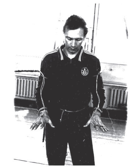 Рис. 3. Общий вид размещения контактных датчиков на руках испытуемого Блок тиристорных пускателей служит для согласования маломощных сигналов, поступающих с блока задания игровых комбинаций, с достаточно мощными потребителями - лампочками накаливания. Блок электрических лампочек предназначен для предъявления моделируемых игровых ситуаций испытуемым. Блок контактных датчиков выдает информацию блоку оценки выбора направления 2-й передачи мяча о касании мяча одного из трех датчиков, один из которых размещен в зоне № 4, второй - в зоне № 3, а третий - в зоне № 2. Блок оценки предназначен для правильности выбора направления второй передачи мяча из двух-трех альтернатив, т.е. в зону № 4, в зону № 3, в зону № 2 по пятибалльной системе оценок: 1, 2, 3, 4, 5. Блок распределения 11 согласует сигналы по уровню, длительности и полярности, а также устанавливает порядок поступления информации к блоку 12. Цифропечатающее устройство записывает номер игровой ситуации, временные параметры второй передачи мяча и оценку точности выбора направления передачи. Блок 13 служит для питания всех узлов устройства. Принцип работы устройства заключается в следующем. Мяч, попавший в гнездо катапульты, выбрасывается в направлении испытуемого, стоящего у волейбольной сетки между зонами № 2 и 3. При вылете из гнезда катапульты мяч пересекает световой луч, направленный на фотодатчик Д 1, сигнал от которого запускает блок задания игровых комбинаций и первый секундомер блока измерения временных параметров и одновременно поступает на блок задержки предъявления игровых ситуаций. Первым секундомером измеряется время слежения за траекторией полета мяча - от момента его вылета из гнезда катапульты до момента касания датчиков, закрепленных на пальцах испытуемого. Генератор коммутатора блока задания игровых комбинаций 3, включенный сигналом от катапульты, выдает управляющий сигнал через блок тиристорных пускателей на узел электрических лампочек, которые включаются в определенных комбинациях. Каждая комбинация лампочек является моделью игровой ситуации одного, двух, трех, четырех напа дающих против одного, двух, трех блокирующих игроков. С момента включения лампочек блоком задания игровых комбинаций перед испытуемым возникает задача выбора направления 2-й передачи мяча (вперед в зону № 4, над собой в зону № 3, назад в зону № 2) в один из трех контактных датчиков (блока 9) Д3, Д4, Д5, которые размещены над волейбольной сеткой в зонах № 4, 2, 3. В момент включения лампочек коммутатор блока 3 выдает еще один сигнал - для запуска второго секундомера блока 4. Он включается сигналом от датчиков 2 так же, как и в первом случае, до момента касания мячом рук испытуемого. Время, регистрируемое вторым секундомером, является временем принятия решения. В момент касания руками мяча включается третий секундомер, который регистрирует время соприкосновения с мячом (время обработки мяча). Он выключается сигналом от датчиков Д2 в момент отрыва мяча от рук. Принятое решение испытуемый реализует с помощью второй передачи мяча в один из трех контактных датчиков, размещенных над волейбольной сеткой соответственно в зонах № 4, 3, 2. Сигнал от одного из датчиков поступает в блок оценки. В этот же блок поступает информация о предъявленной испытуемому игровой комбинации от коммутатора блока задания игров