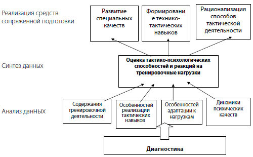 Рис. 1 Принципиальная схема реализации сопряженного метода Совершенствование тактической подготовленности боксеров не может ограничиваться совершенствованием технико-тактических знаний, умений, навыков. Необходимо параллельное воздействие, как на психическую, так и двигательную сферу спортсмена. Сопряженность в данном случае рассматривается как оптимальная взаимосвязь нагрузок различной преимущественной направленности, развивающих или поддерживающих уровень двигательных и психических качеств спортсменов. Применяемые нами средства и методы имели так тическ ую направленность и позволяли, наряду с совершенствованием так тических навыков, корригировать состояние перцептивнопсихомоторной и когнитивной сферы спортсменов. Реализация принципа сопряженности достигалась моделированием соревновательной деятельности тренировочными средствами, как по уровню функциональных сдвигов, технической сложности, тактической непредсказуемости ситуаций, так и по эмоциональному фону. Такие воздействия могут осуществляться последовательно (после применения средств воздействия на физическую сферу, применяются психические средства, оказывающие косвенное влияние и на физическую) и параллельно (применяются упражнения, избирательно воздействующие на одни и те же компоненты двигательной и психической сферы спортсмена). Нами рекомендовалось применение разнонаправленных тренировочных занятий в микроцикле ("на быстроту", "на взрывную силу", "на максимальную волевую концентрацию", "на эффективные альтернативные решения"), что давало эффект "перераспределения" нагрузки на разные функциональные системы организма и создавало возможность повышать степень воздействия нагрузок, не подвергая спортсменов опасности переутомления и травматизма. Взаимосвязанное развитие тактических навыков и психических качеств является обязательным звеном (подсистемой) в системе управления процессом тактико-психологической подготовки боксеров. Однако психические качества развиваются не изолированно, как это бывает в большинстве предлагаемых систем психологической подготовки, а в процессе принятия и реализации оперативных (тактических) решений, когда боксер ставится в условия, при которых проявление комплекса таких качеств оказывается обязательным условием эффективности деятельности. Особую роль при этом грают специальные "тактико-психологические упражнения боксера", которые воздействуют не только на процесс совершенствования тактических навыков, но и на создание психологических предпосылок для реализации таких навыков в условных ситуациях единоборства. Важным компонентом тренировочного процесса, построенного по принципу сопряженности, являются адекватные психологические установки. Когда боксер выполняет техническое упражнение с установкой на быстроту или мощность производимой работы, тем самым, он сопряжено развивает физические качества и технические навыки. Когда он выполняет тактическое упражнение с такими же установками, он сопряжено развивает физические качества и тактические навыки. Установки в условном или вольном бою могут проявляться в виде сформированной готовности, например, постоянно опережать соперника встречной контратакой или стремиться выполнять двух-трех-ударные комбинации против соперника, который "з