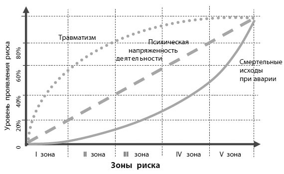 Рис. 1. Уровень психической напряженности, травматизма и смертности в зависимости от степени риска