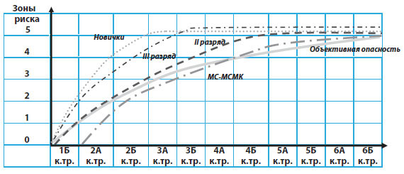 опасность маршрута для подготовленного спортсмена, для МС; для II разр.; ...новички к. тр. - категория трудности восходительского маршрута Рис. 2. Уровень риска в зависимости от квалификации спортсмена и трудности проходимого маршрута