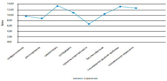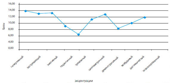 Рис.1. Напряженность копинга у спортсменов с инвалидизирующим поражением опорно-двигательного аппарата. С целью изучения характерологических особенностей спортсменов с ПОДА были проанализироны выделенные К. Леонгардом акцентуации характера (демонстративный, педантичный, застревающий, возбудимый) и темперамента (гипертимический, дистимический, тревожно-боязливый, циклотимический, аффективный, эмотивный). Оценивались только выраженные (18-24 балла по опроснику Леонгарда в модификации Шмишека) акцентуации. Наиболее распространенным типом характера был застревающий (28,1% случаев), для него были свойственны проявления заносчивости, самонадеянности, жесткости установок и взглядов, инертности в мышлении, склонности к нравоучениям, аффектам (обидчивость, ревность), уязвимость, подозрительность, конфликтность, чувствительность к нередко мнимой несправедливости по отношению к нему, неспособность легко отходить от обид, злопамятность, эпилептоидные черты. Акцентуированность темперамента чаще всего (21,9% обследованных) отмечалась по гипертимному типу, наблюдались подвижность, общительность, болтливость, выраженность жестов, мимики, пантомимики, чрезмерная самостоятельность, недостаток чувства дистанции в отношениях с другими, поверхностность, легкомысленность, повышенная самооценка, недостаточно серьезное отношение к наблюдению у врача, необходимым медицинским процедурам, неприятие жесткой дисциплины, одиночества. Профиль средних значений акцентуированности характера и темперамента в исследуемой группе представлен на рис. 2.