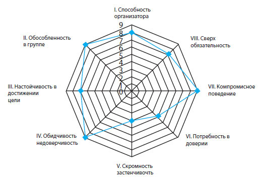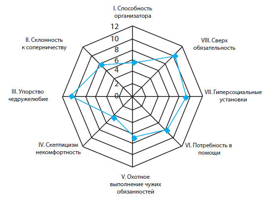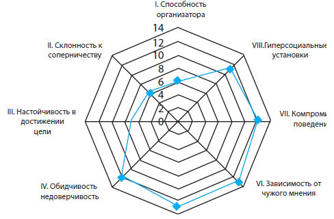 Рис. 2. Профиль личности наставника сборной женской команды России, заслуженного тренера И.А. Еськова Однако он испытывал неудовлетворенность собою, на что указывают данные выбранного им идеального профиля личности (рис.3). Ему хотелось быть более авторитетным лидером - октант І в 9 баллов, уменьшить подчиненность октант V в 4 балла, зависимость - октант VІ в 2 балла и не всегда быть таким настойчивым - октант VІІ в 6 баллов. В этот период тренеру не помешала бы помощь психолога для обретения равновесия.