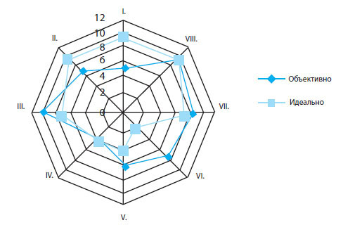 Рис. 3. Объективный и идеальный профили личности заслуженного тренера. И.А. Еськова. В начале спортивного сезона 2005/2006 на сборе в Тольятти атмосфера в национальной сборной команде была конфликтная. Как тренер Евгений Трефилов - опытный профессионал. Однако значительная часть игроков не подчинялись тренеру, девушки капризничали и просто не выполняли его требований. Причина, казалось, заключалась в том, что тренер уходил из местной команды на новое место работы, уводя с собой нескольких игроков. Но исследование личностных качеств наставника сборной команды дало основание увидеть более глубокие причины такого отношения к нему. Активные качества І октанта (авторитарность) и ІІ октанта (эгоистичность) у него имеют умеренную выраженность всего шестью баллами - это указывает на способность организатора и склонность к соперничеству (рис.4). Октант ІІІ (агрессия) на уровне 7 баллов характеризует настойчивость в достижении цели. А высокая выраженность октанта ІV (критичность) в 12 баллов означает, что он слишком обидчив и недоверчив, испытывает трудности в контактах с людьми. Совершенно неожиданными были показатели, по октантам V (подчиненность) и VІ (зависимость), которые были выражены 13 (!) баллами. Это значит - полная покорность и зависимость от чужого мнения. Октанта VІІ (дружелюбие) - 12 баллов отражает компромиссное поведение, как и у двух других тренеров женских команд. Данные октанта VІІІ (альтруизм) - 11 баллов указывают на гиперсоциальные установки в деятельности. Его личностные качества в момент нашего исследования были смещены в сторону зависимых.